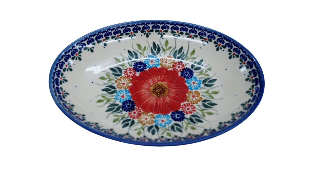 Oryginalny produkt ceramiki bolesławieckiej - półmisek jajko mały, ręcznie malowany wyrób ceramiki użytkowej, powstał w rodzinnej fabryce oryginalnej ceramiki bolesławieckiej, ANDY CERAMIKA.