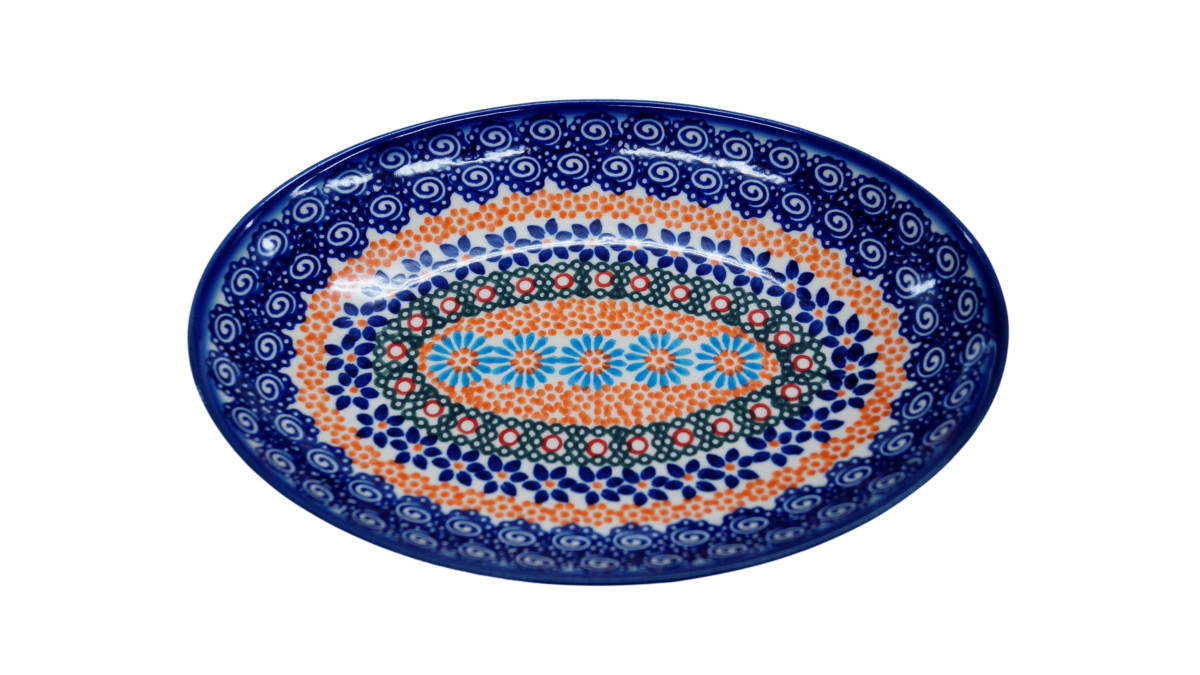 Oryginalny produkt ceramiki bolesławieckiej - półmisek jajko mały, ręcznie malowany wyrób ceramiki użytkowej, powstał w rodzinnej fabryce oryginalnej ceramiki bolesławieckiej, ANDY CERAMIKA.