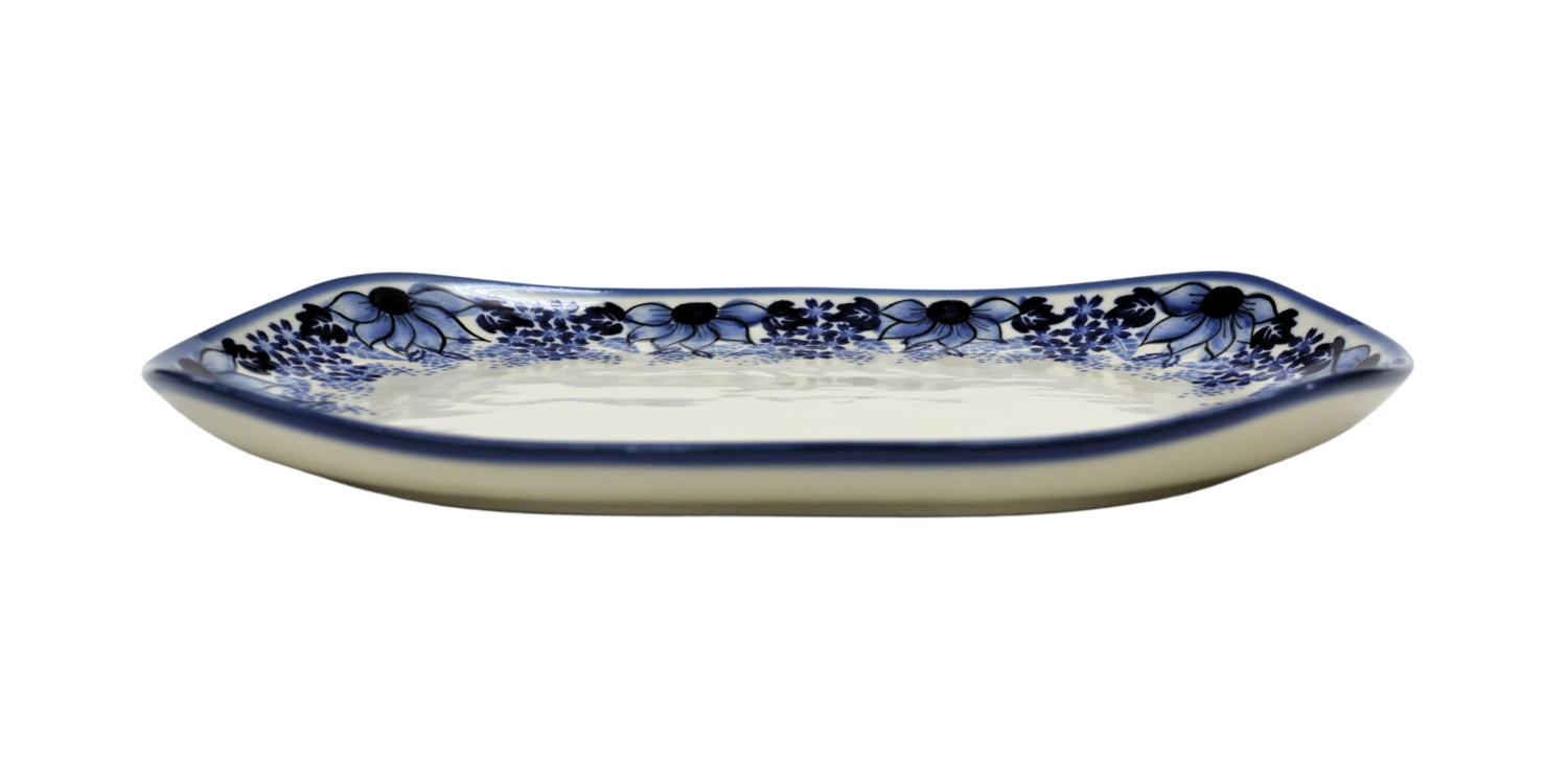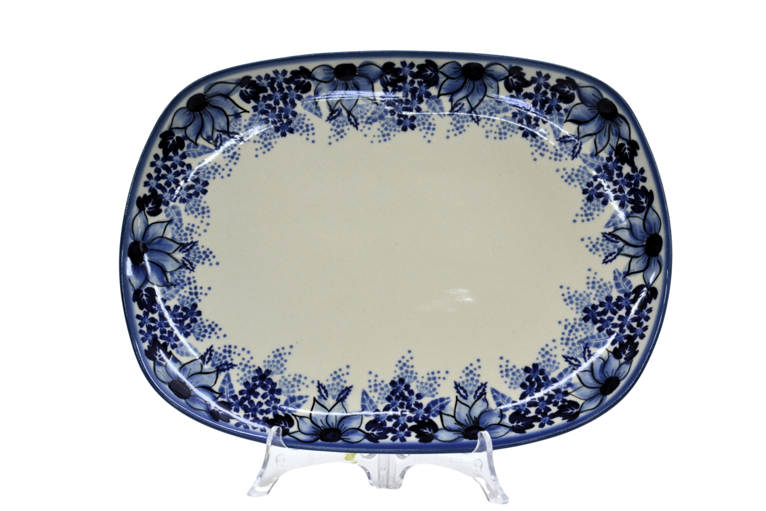 Półmisek w kształcie prostokąta wpisanego w owal, stąd biorą się finezyjnie zagięte rogi naczynia, doskonałe połączenie elementu dekoracyjnego i użytkowego. Wyjątkowy kształt pasujący do każdego wystroju. Pięknie wkomponuje się w inne elementy zastawy ceramiki bolesławieckiej, tworząc idealną całość i nadając jej funkcjonalności.