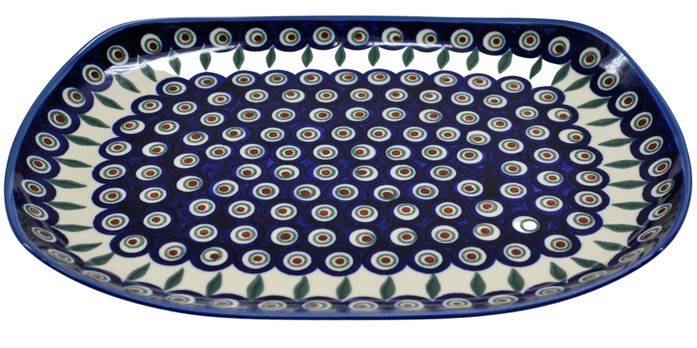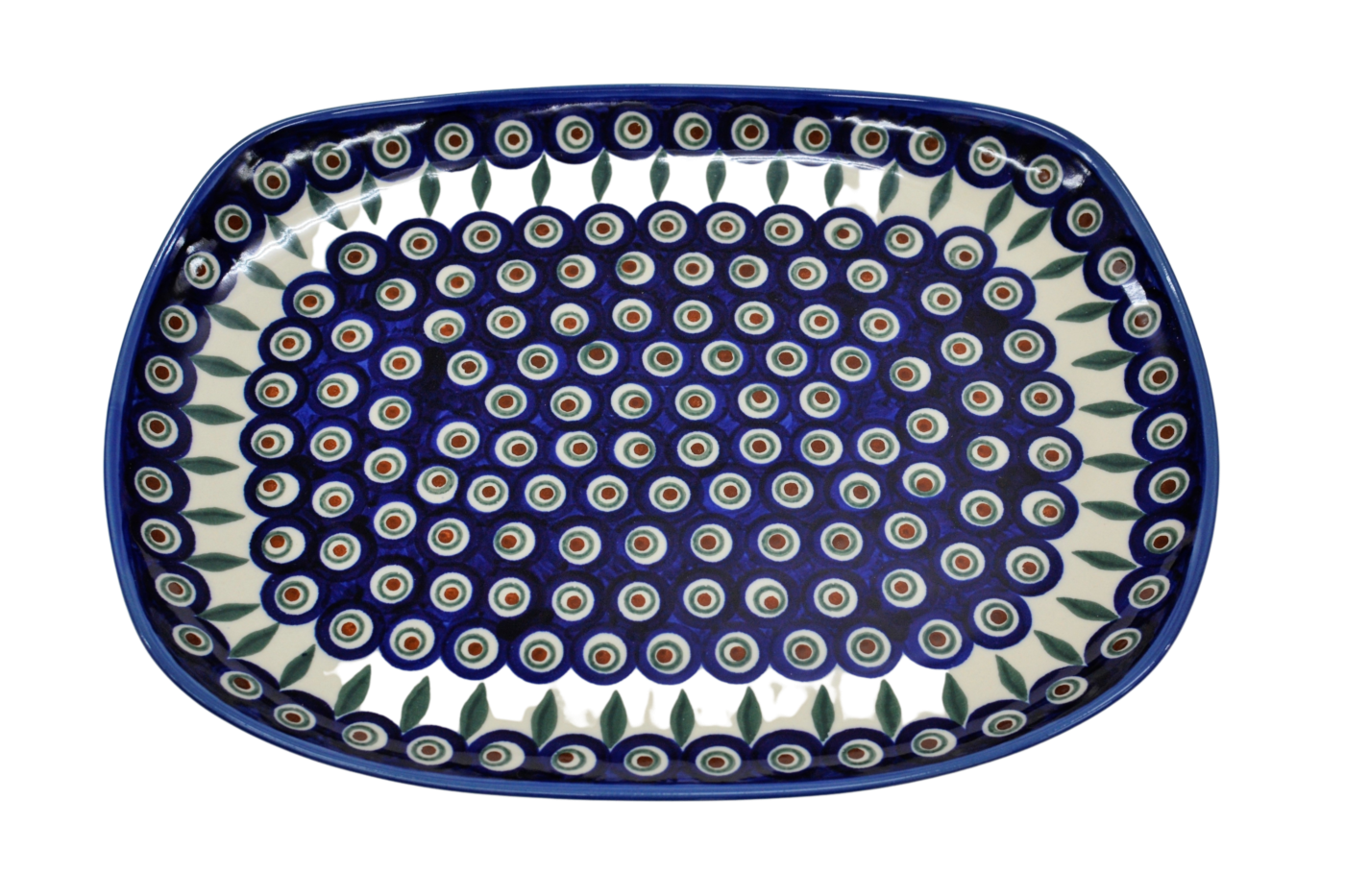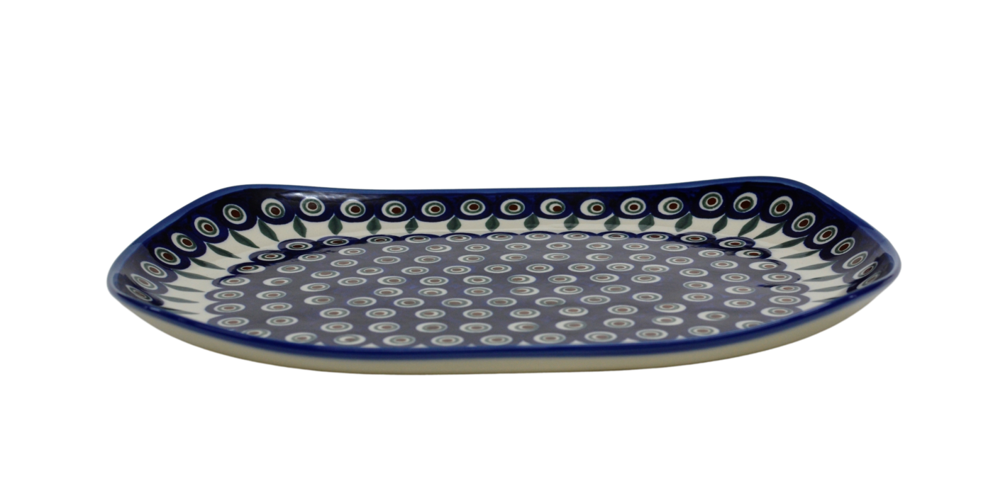 Półmisek w kształcie prostokąta wpisanego w owal, stąd biorą się finezyjnie zagięte rogi naczynia, doskonałe połączenie elementu dekoracyjnego i użytkowego. Wyjątkowy kształt pasujący do każdego wystroju. Pięknie wkomponuje się w inne elementy zastawy ceramiki bolesławieckiej, tworząc idealną całość i nadając jej funkcjonalności.