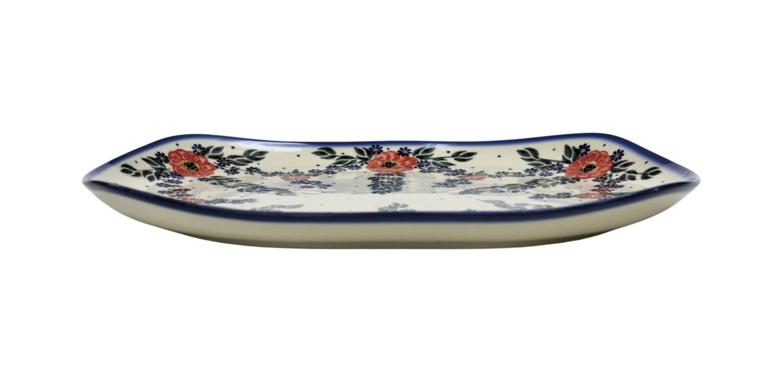 Półmisek w kształcie prostokąta wpisanego w owal, stąd biorą się finezyjnie zagięte rogi naczynia, doskonałe połączenie elementu dekoracyjnego i użytkowego. Wyjątkowy kształt pasujący do każdego wystroju. Pięknie wkomponuje się w inne elementy zastawy ceramiki bolesławieckiej, tworząc idealną całość i nadając jej funkcjonalności.