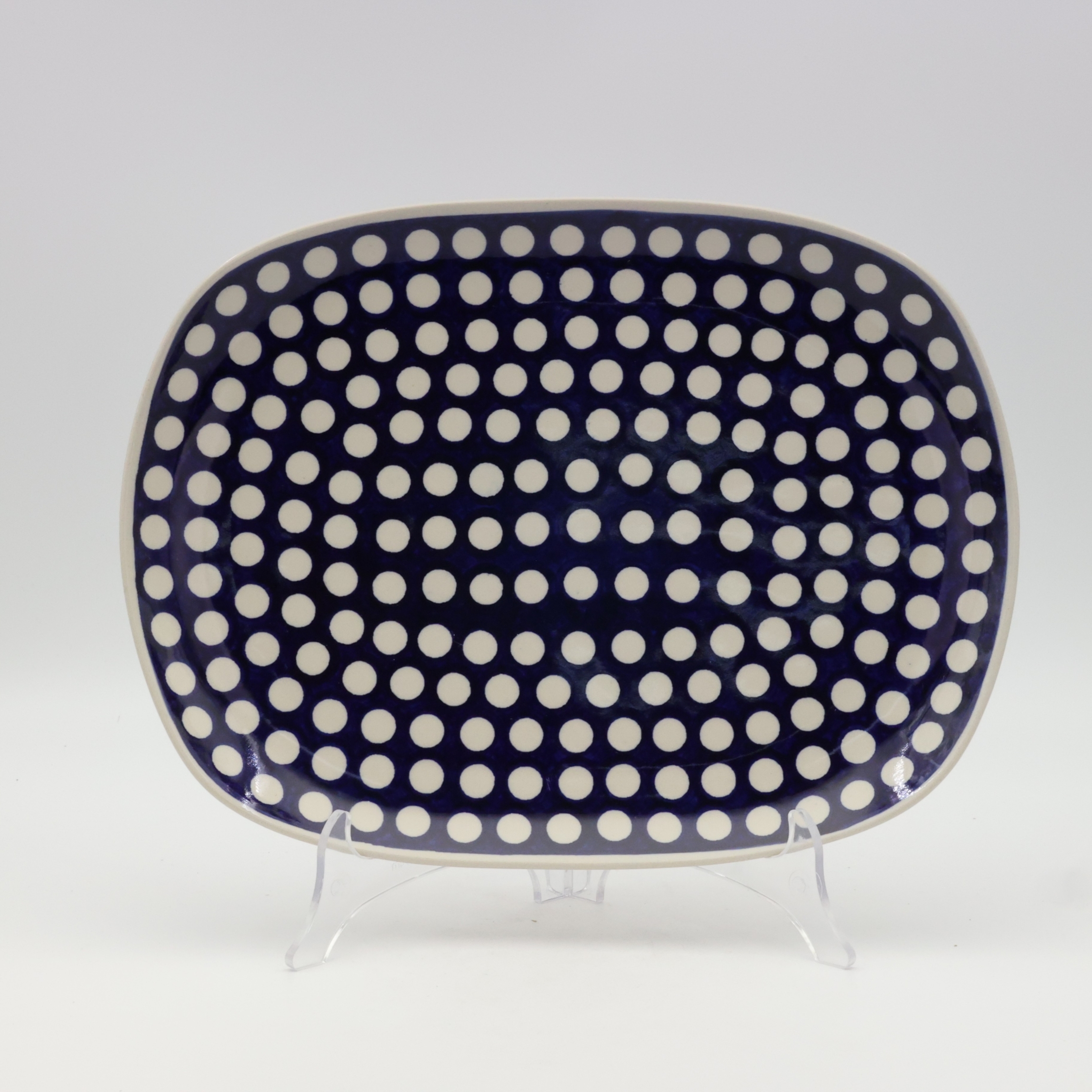 Półmisek w kształcie prostokąta wpisanego w owal, stąd biorą się finezyjnie zagięte rogi naczynia, doskonałe połączenie elementu dekoracyjnego i użytkowego. Wyjątkowy kształt pasujący do każdego wystroju. Pięknie wkomponuje się w inne elementy zastawy ceramiki bolesławieckiej, tworząc idealną całość i nadając jej funkcjonalności.