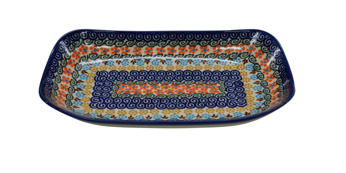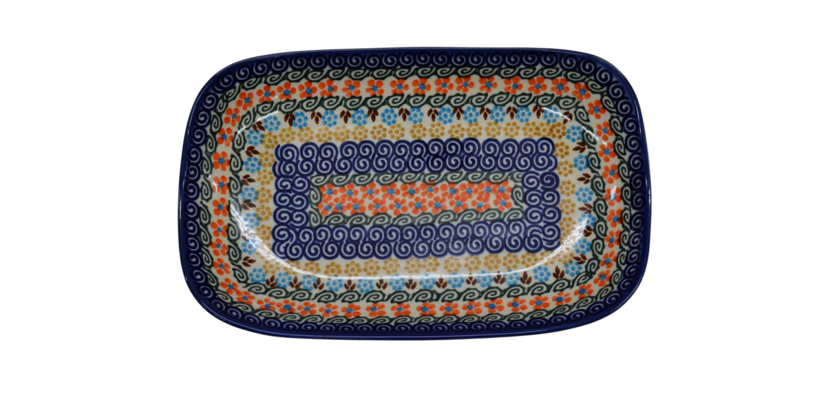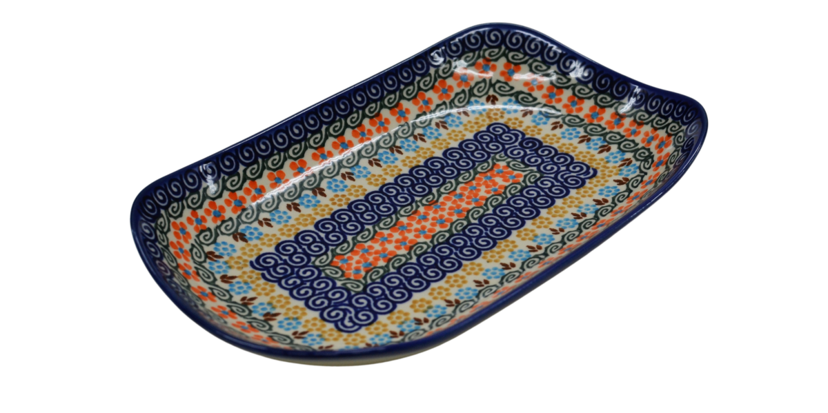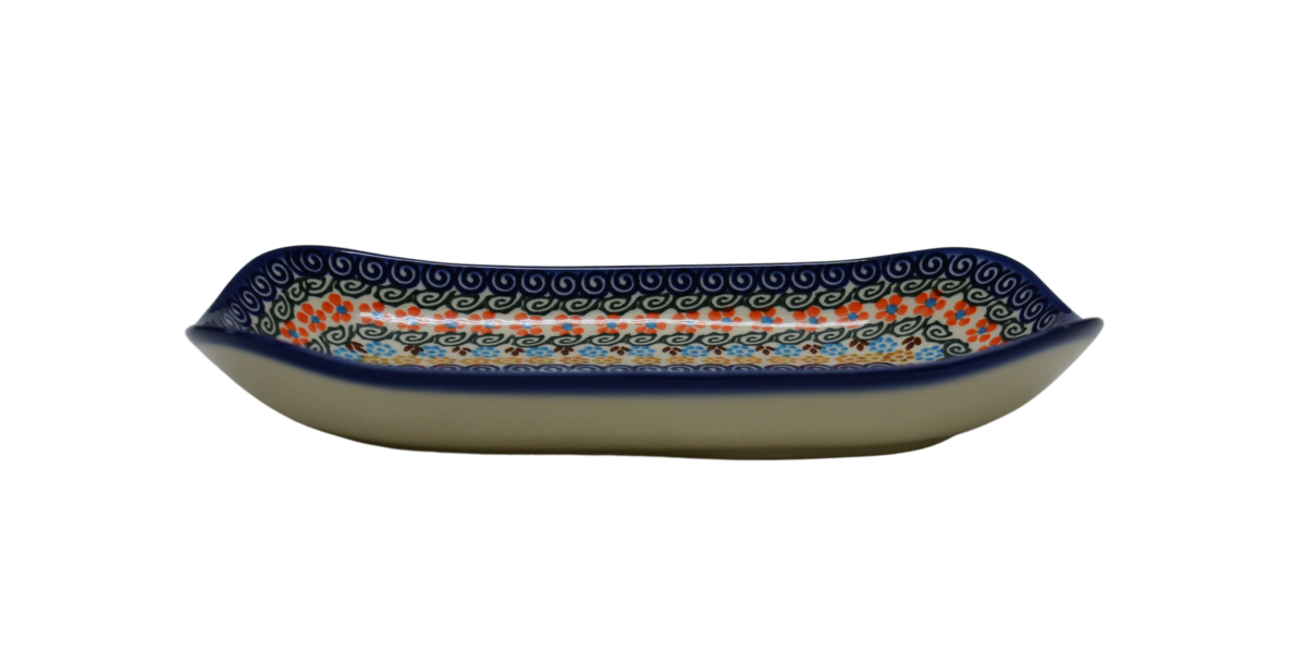 Półmisek w kształcie prostokąta wpisanego w owal, stąd biorą się finezyjnie zagięte rogi naczynia, doskonałe połączenie elementu dekoracyjnego i użytkowego. Wyjątkowy kształt pasujący do każdego wystroju. Pięknie wkomponuje się w inne elementy zastawy ceramiki bolesławieckiej, tworząc idealną całość i nadając jej funkcjonalności i oryginalnej prezencji.
