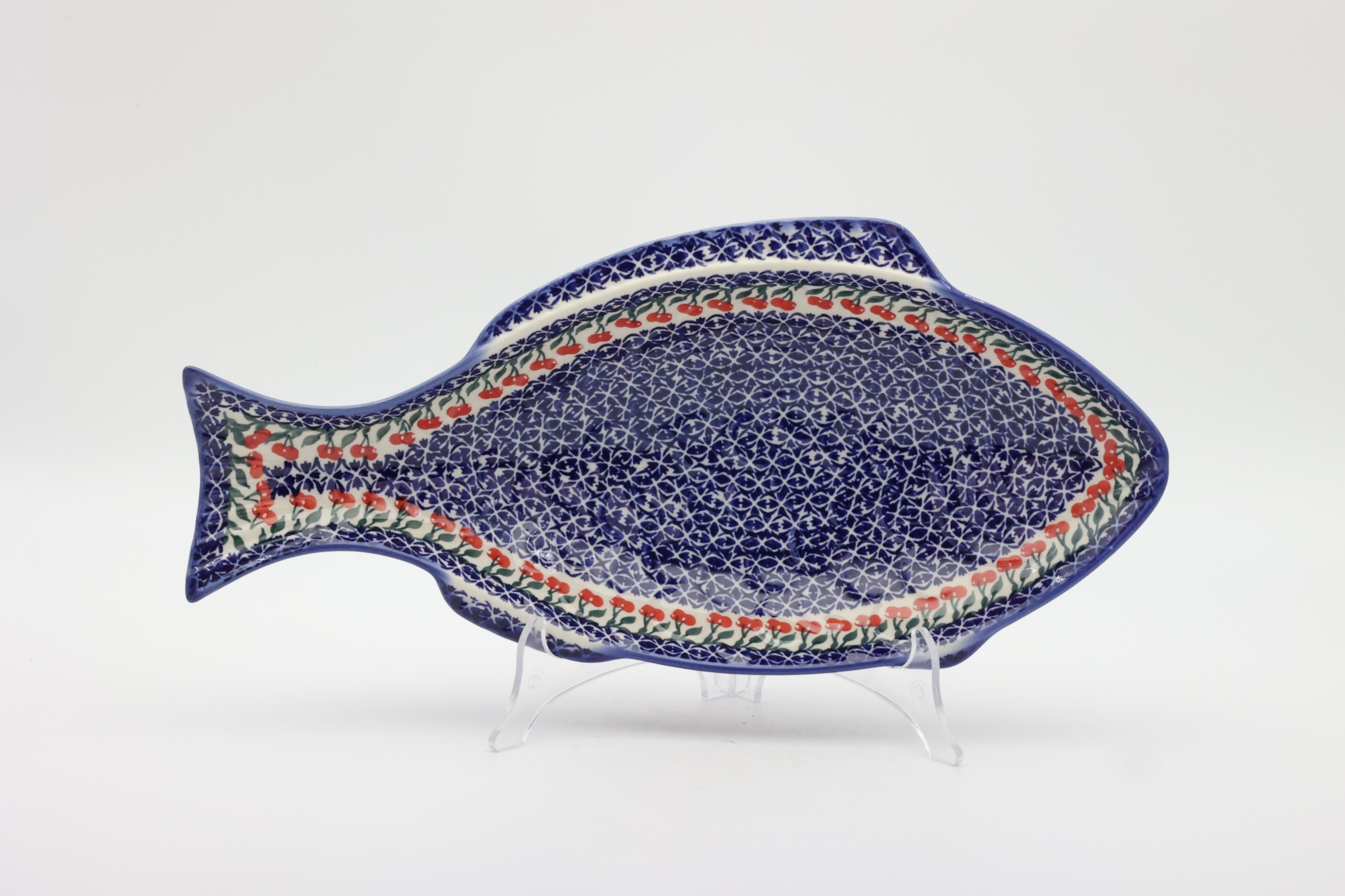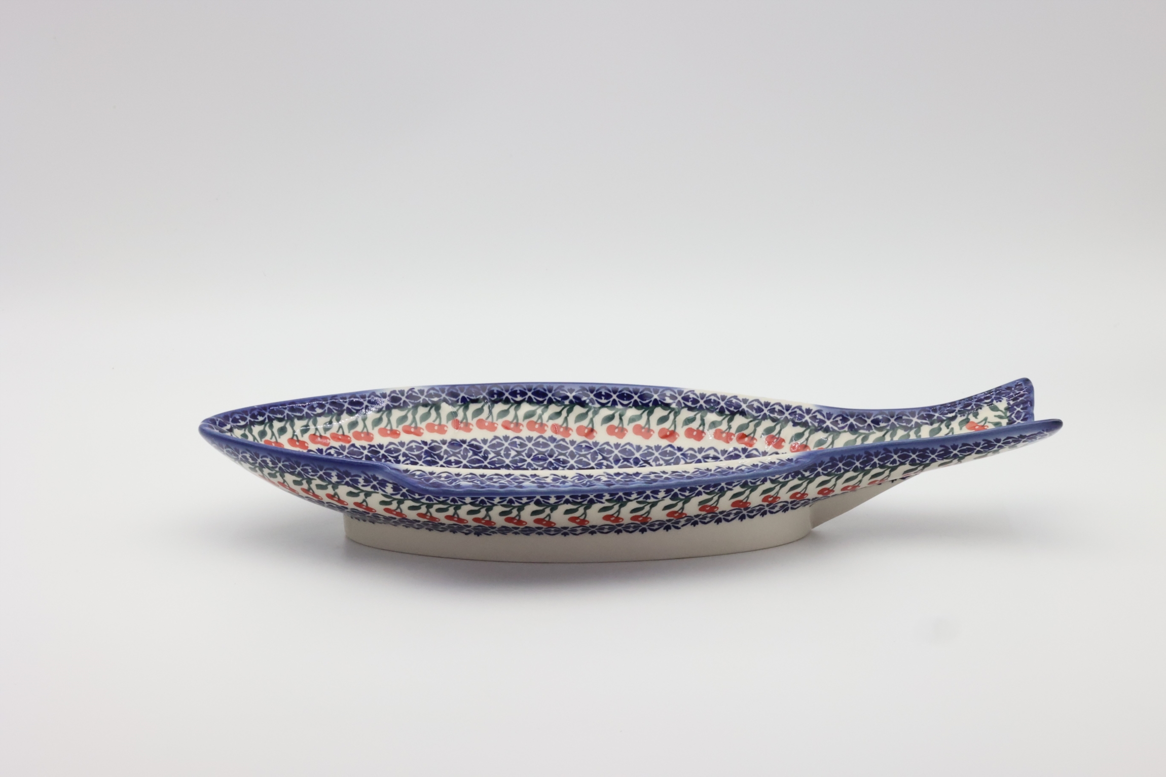 Ceramiczny półmisek z Bolesławca do zapiekania ryby o długości 43 cm, ręcznie malowany w unikatowe wzory oraz dekoracje stempelkowe, podszkliwne. Półmisek o kształcie ryby przeznaczony do pieczenia ryb i ich podawania.
