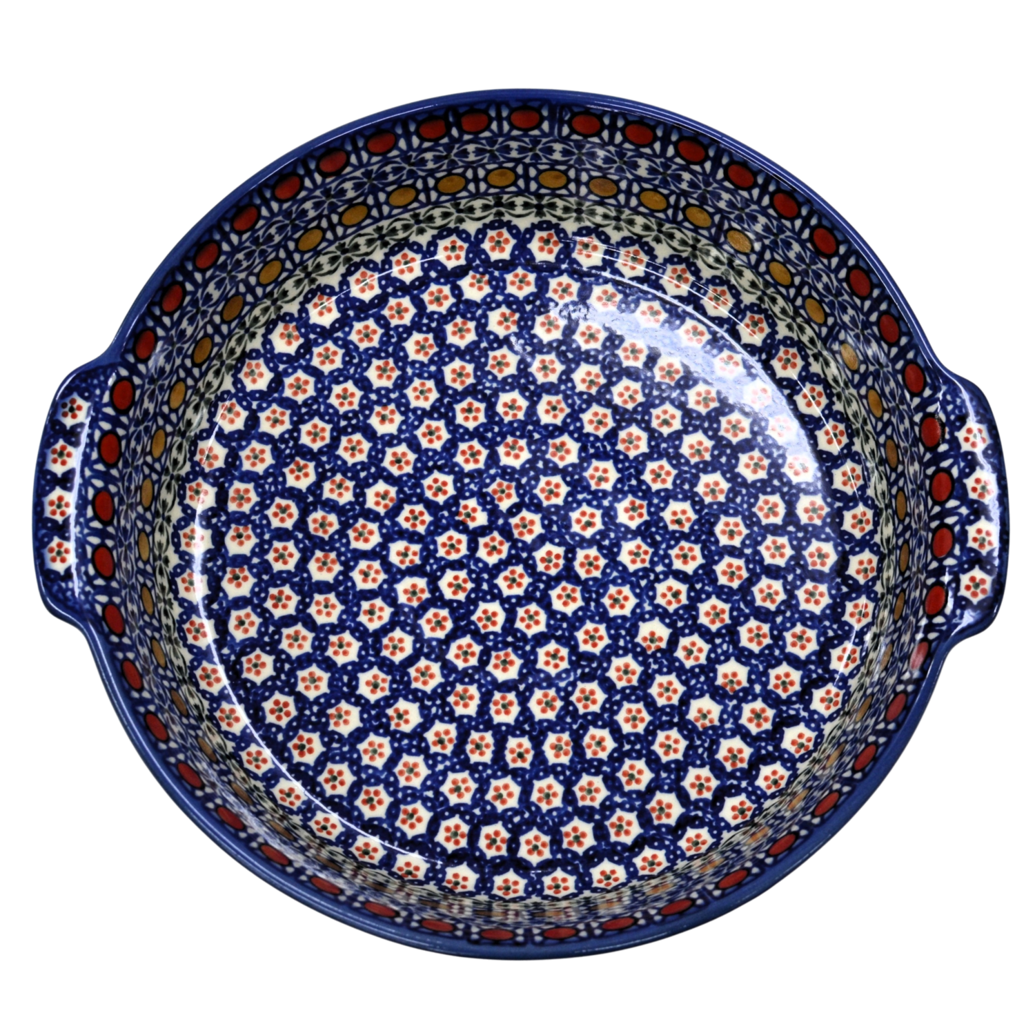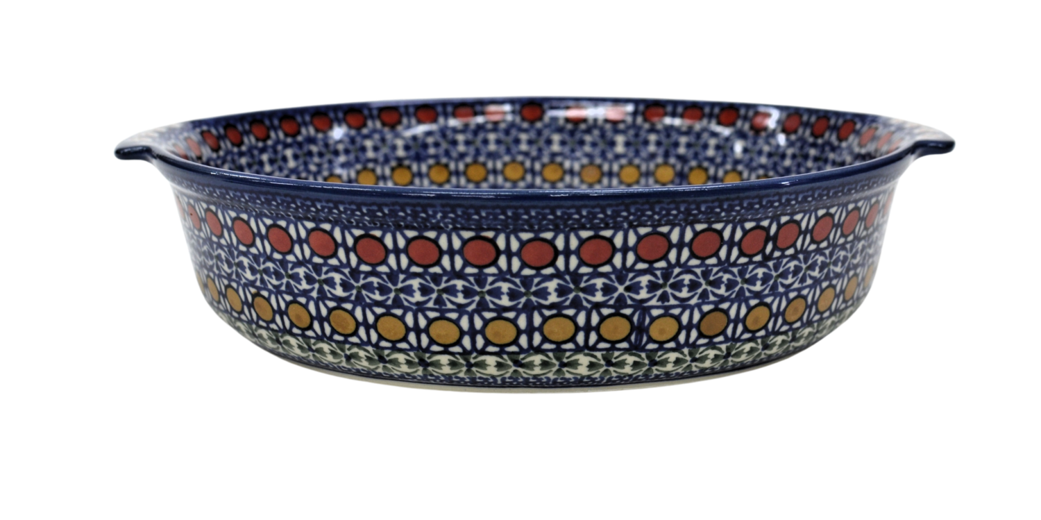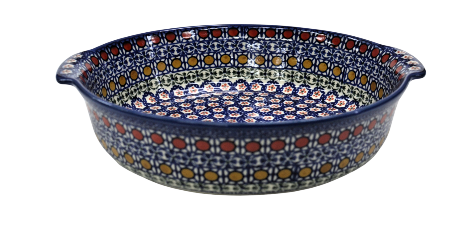 Bolesławiecki ceramiczny półmisek z uszami o szerokości 29 cm. Naczynie ceramiczne do serwowania i zapiekania potraw. Wysunięte na zewnątrz uszy (uchwyty) ułatwiają przenoszenie rozgrzanego naczynia.