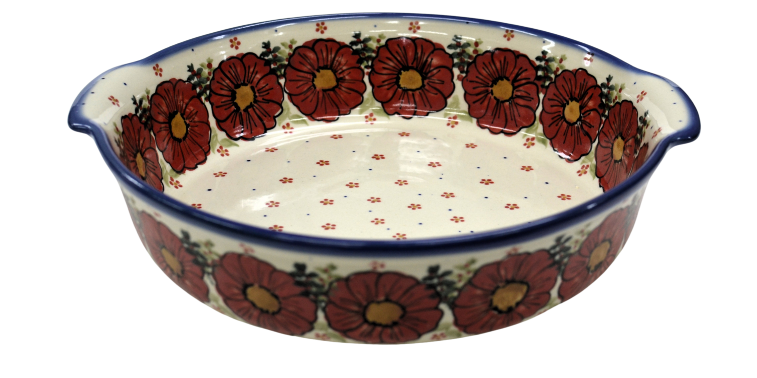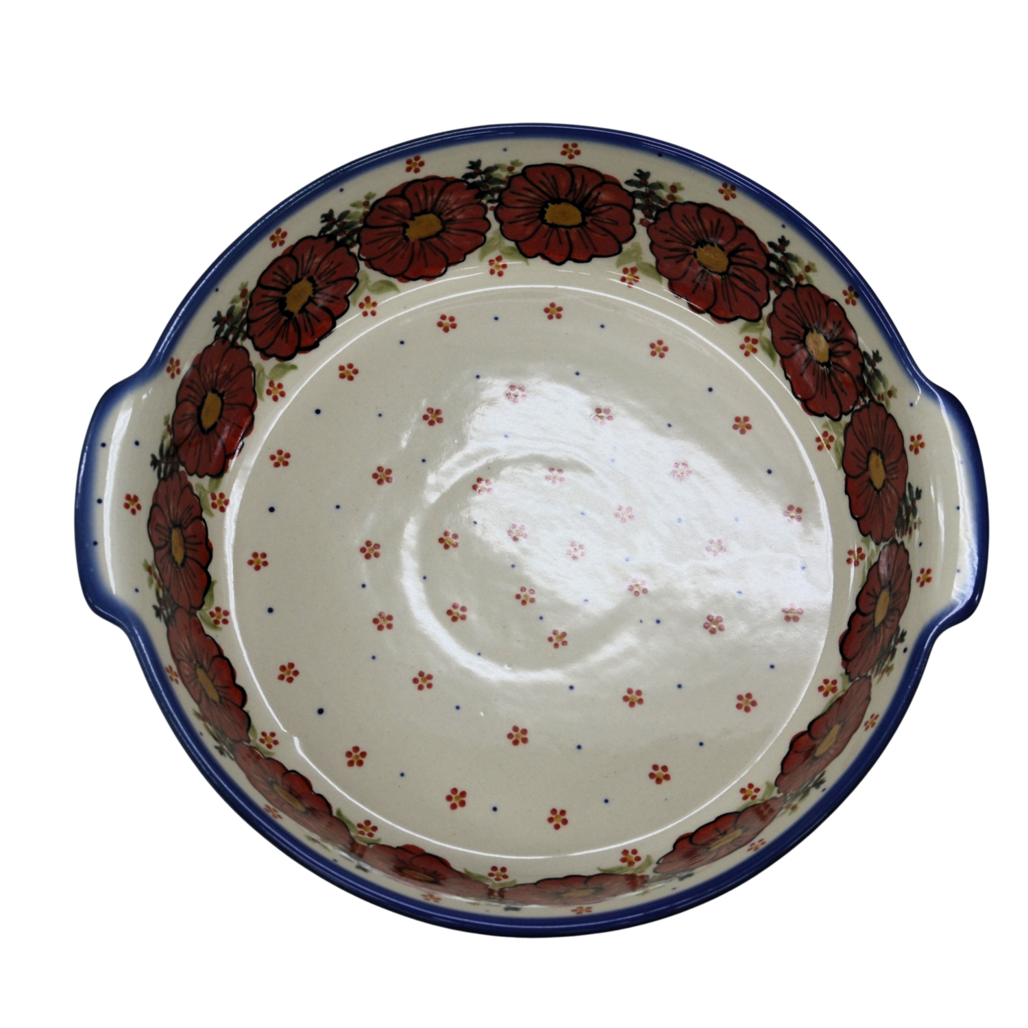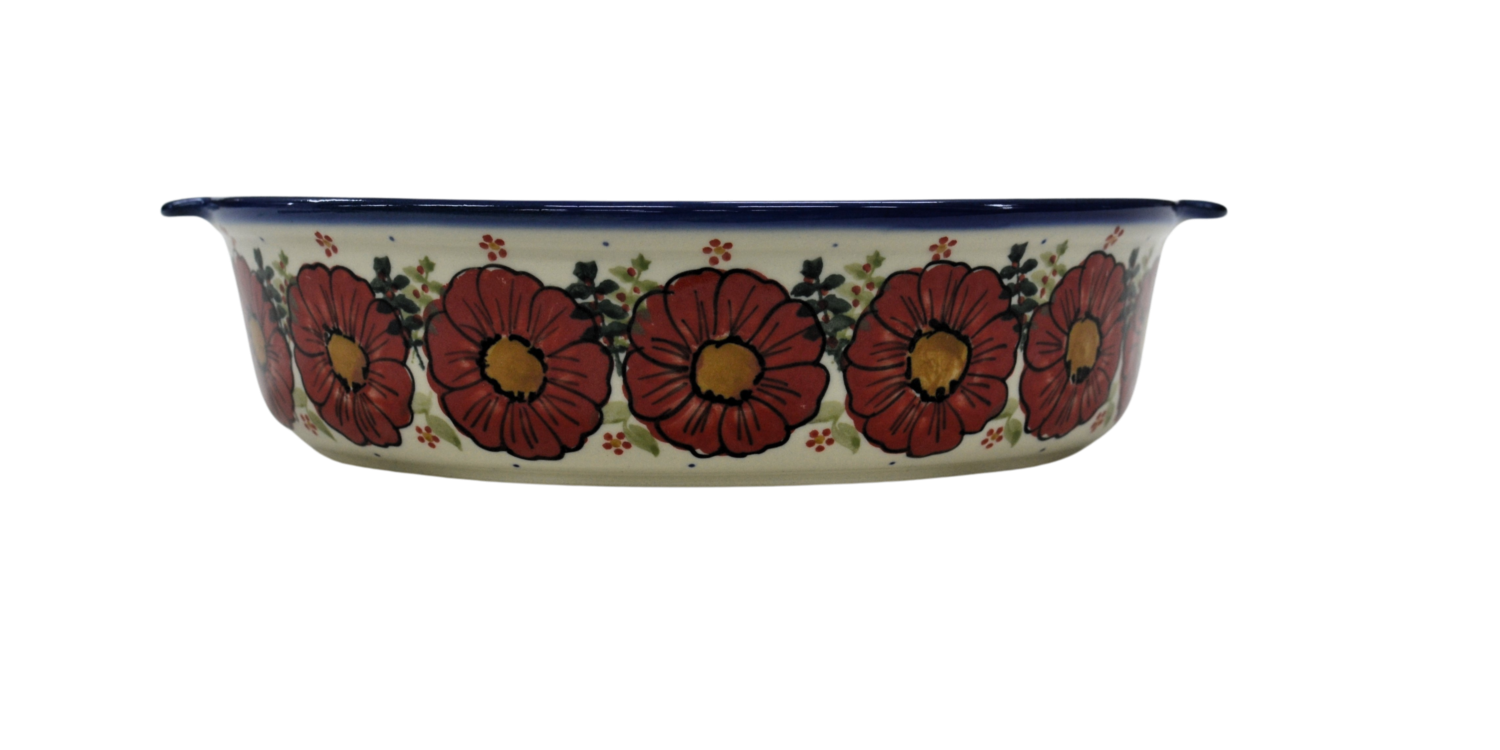 Bolesławiecki ceramiczny półmisek z uszami o szerokości 29 cm. Naczynie ceramiczne do serwowania i zapiekania potraw. Wysunięte na zewnątrz uszy (uchwyty) ułatwiają przenoszenie rozgrzanego naczynia.