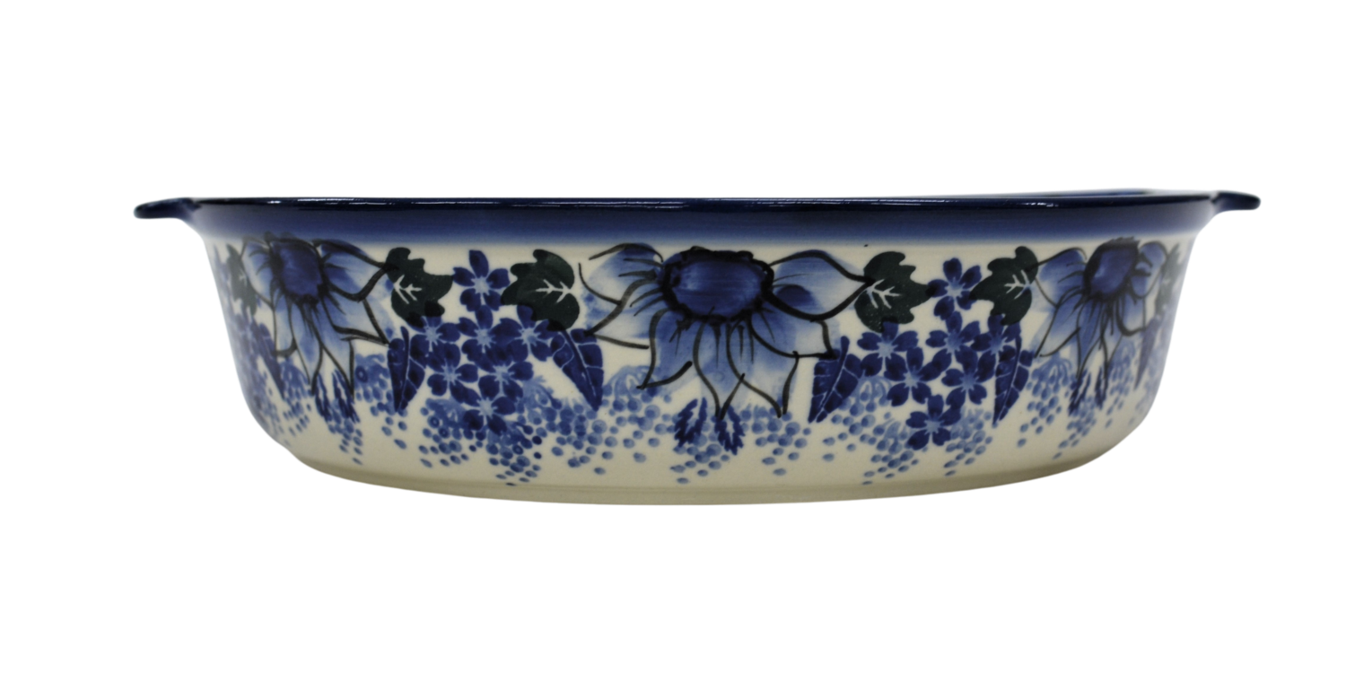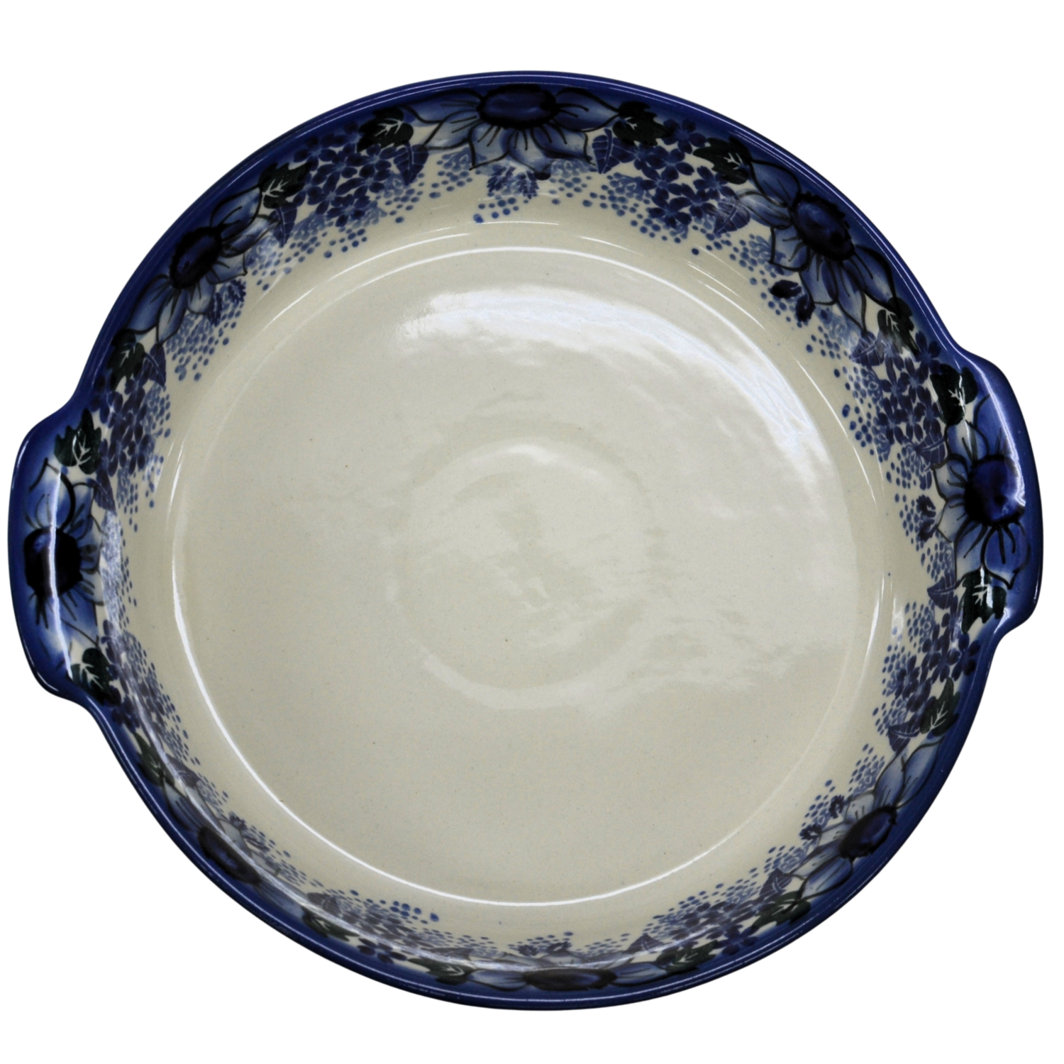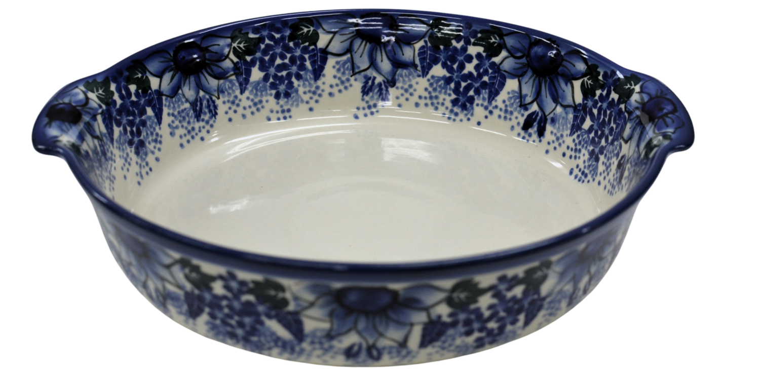 Bolesławiecki ceramiczny półmisek z uszami o szerokości 29 cm. Naczynie ceramiczne do serwowania i zapiekania potraw. Wysunięte na zewnątrz uszy (uchwyty) ułatwiają przenoszenie rozgrzanego naczynia.