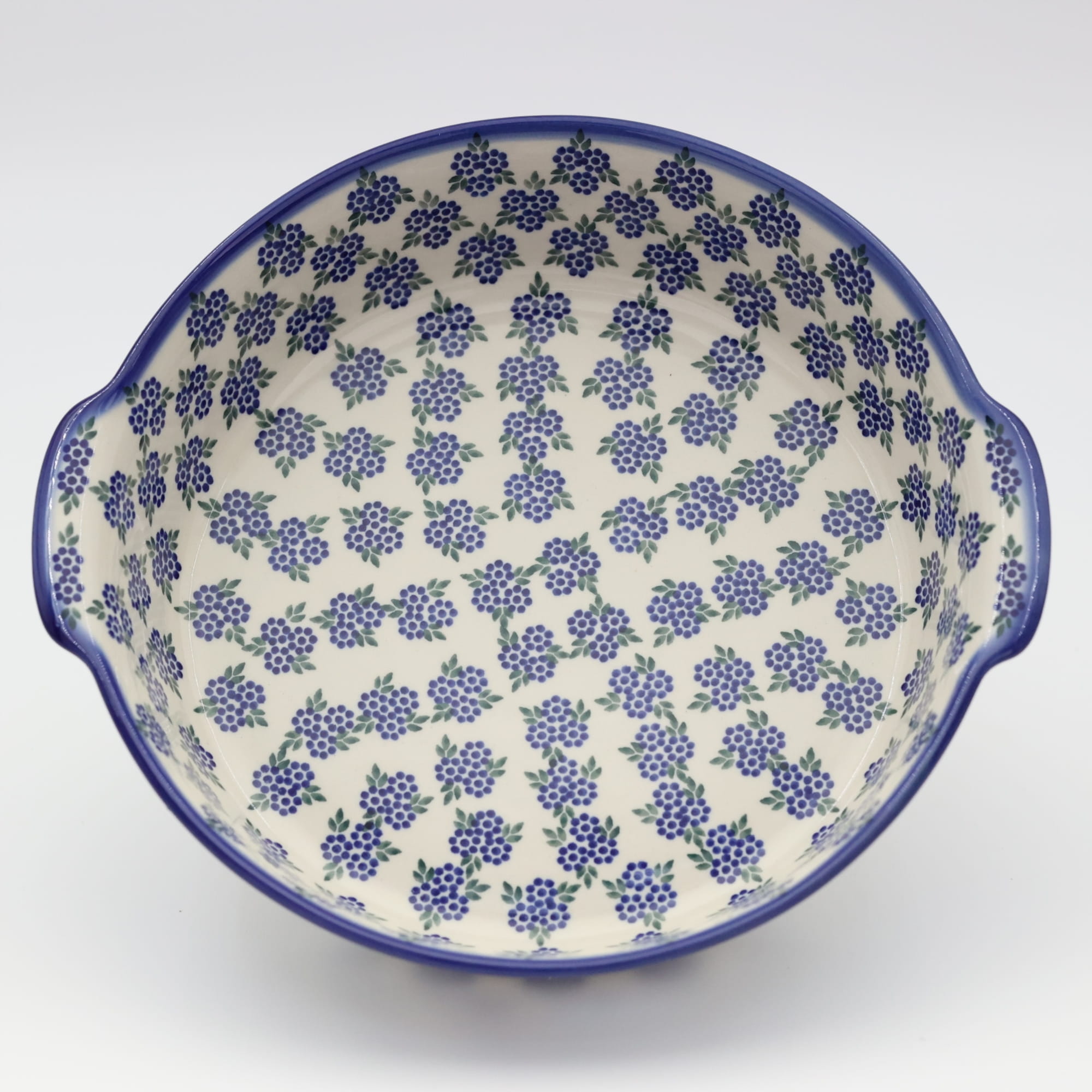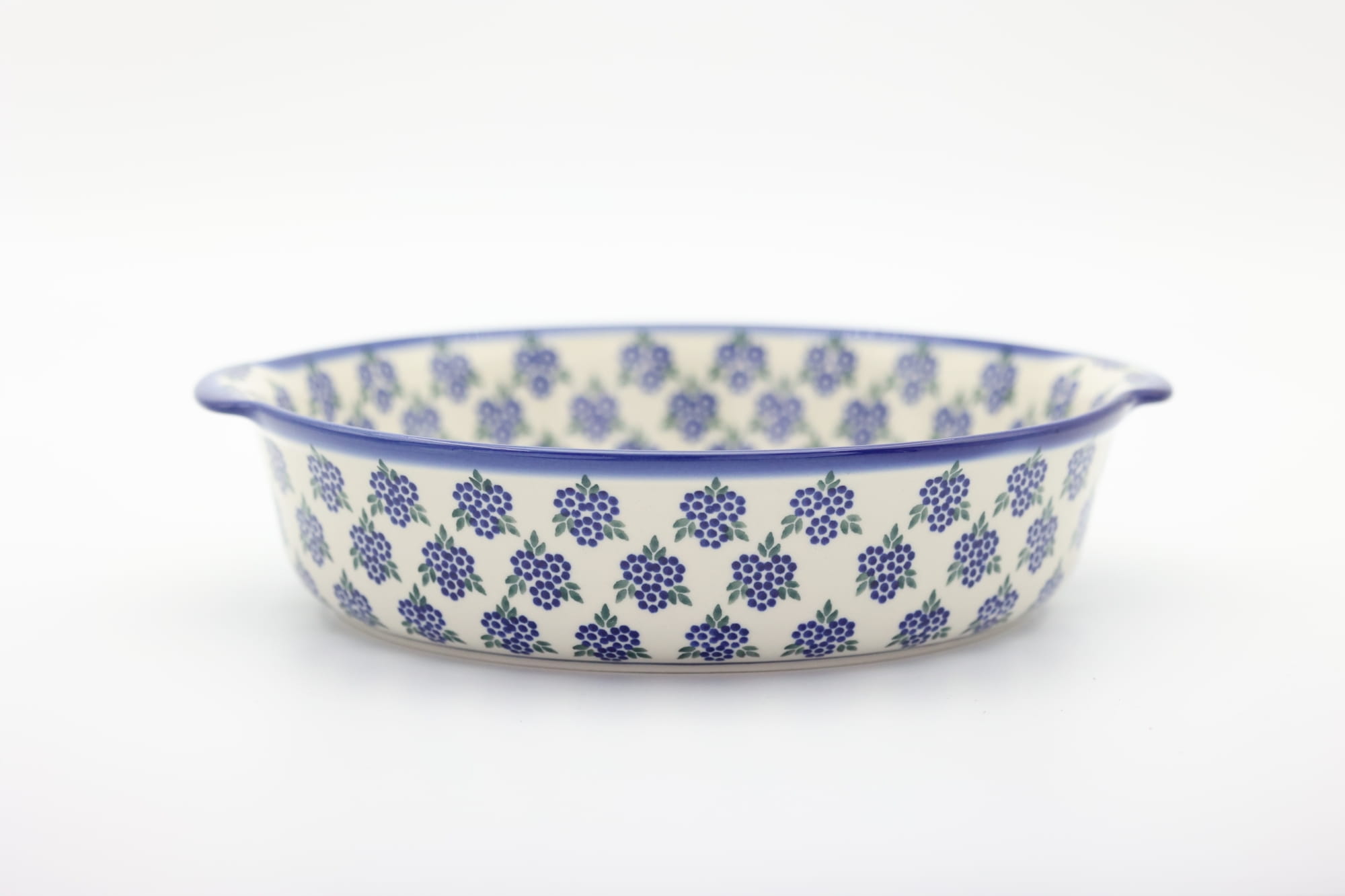 Bolesławiecki ceramiczny półmisek z uszami o szerokości 29 cm. Naczynie ceramiczne do serwowania i zapiekania potraw. Wysunięte na zewnątrz uszy (uchwyty) ułatwiają przenoszenie rozgrzanego naczynia.