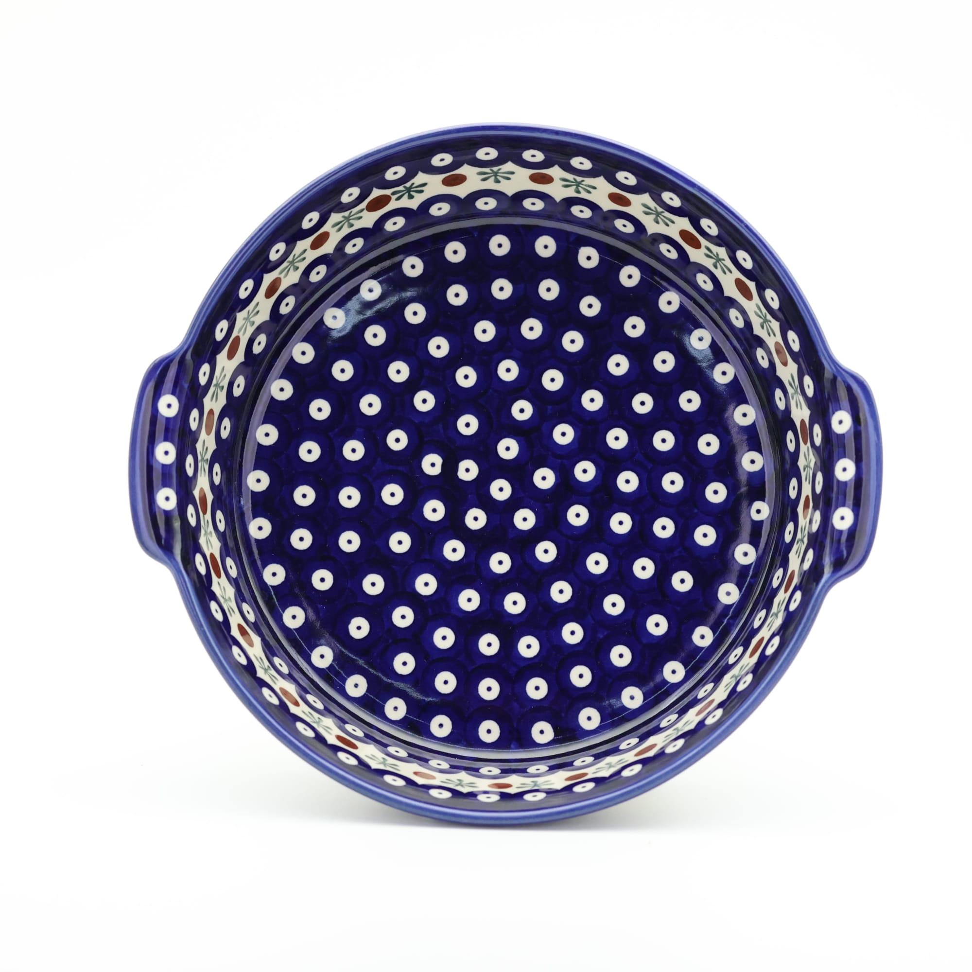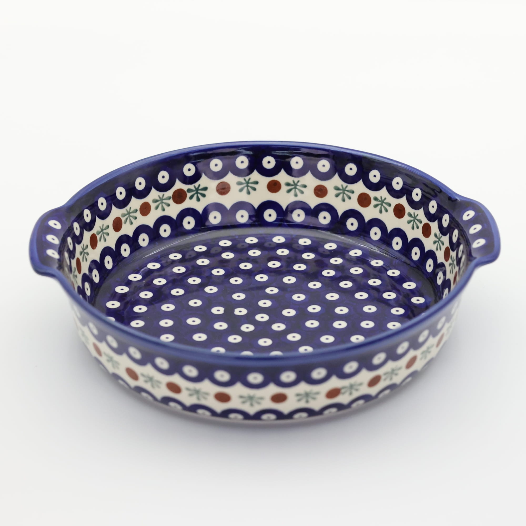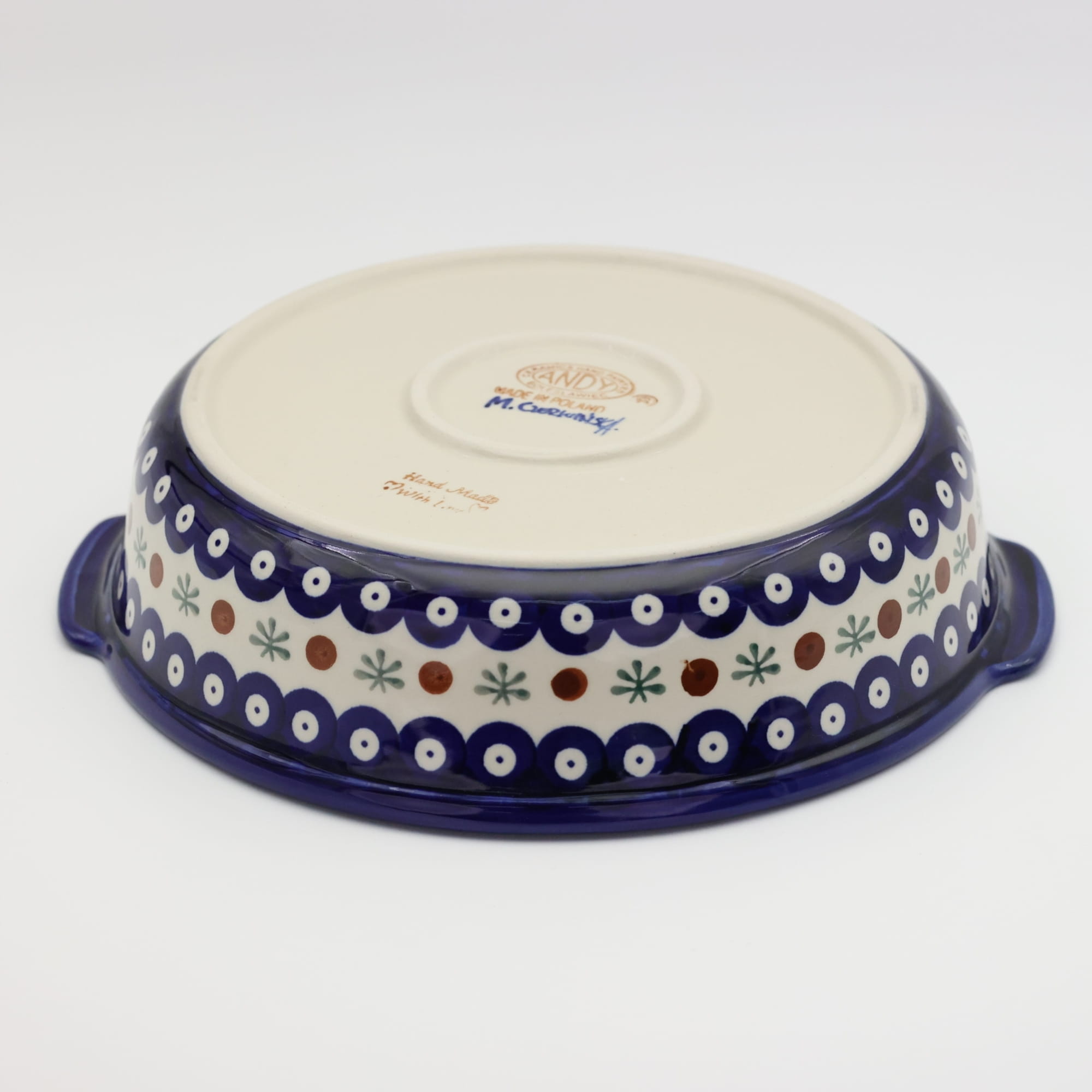 Bolesławiecki ceramiczny półmisek z uszami o szerokości 29 cm. Naczynie ceramiczne do serwowania i zapiekania potraw. Wysunięte na zewnątrz uszy (uchwyty) ułatwiają przenoszenie rozgrzanego naczynia.