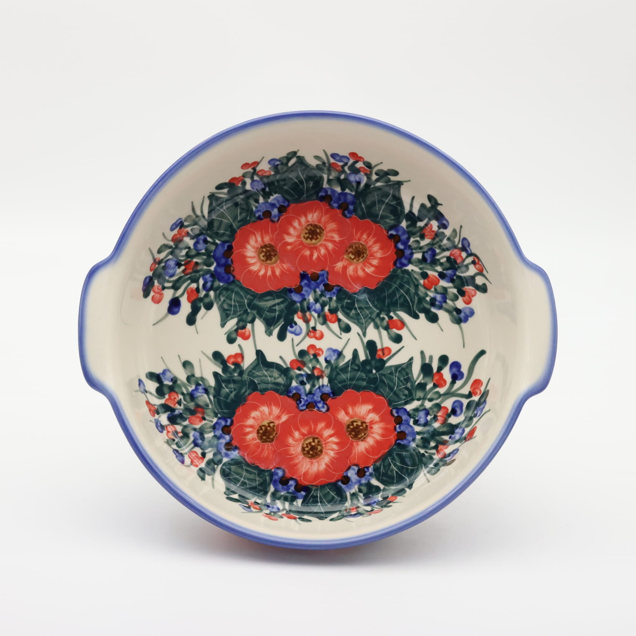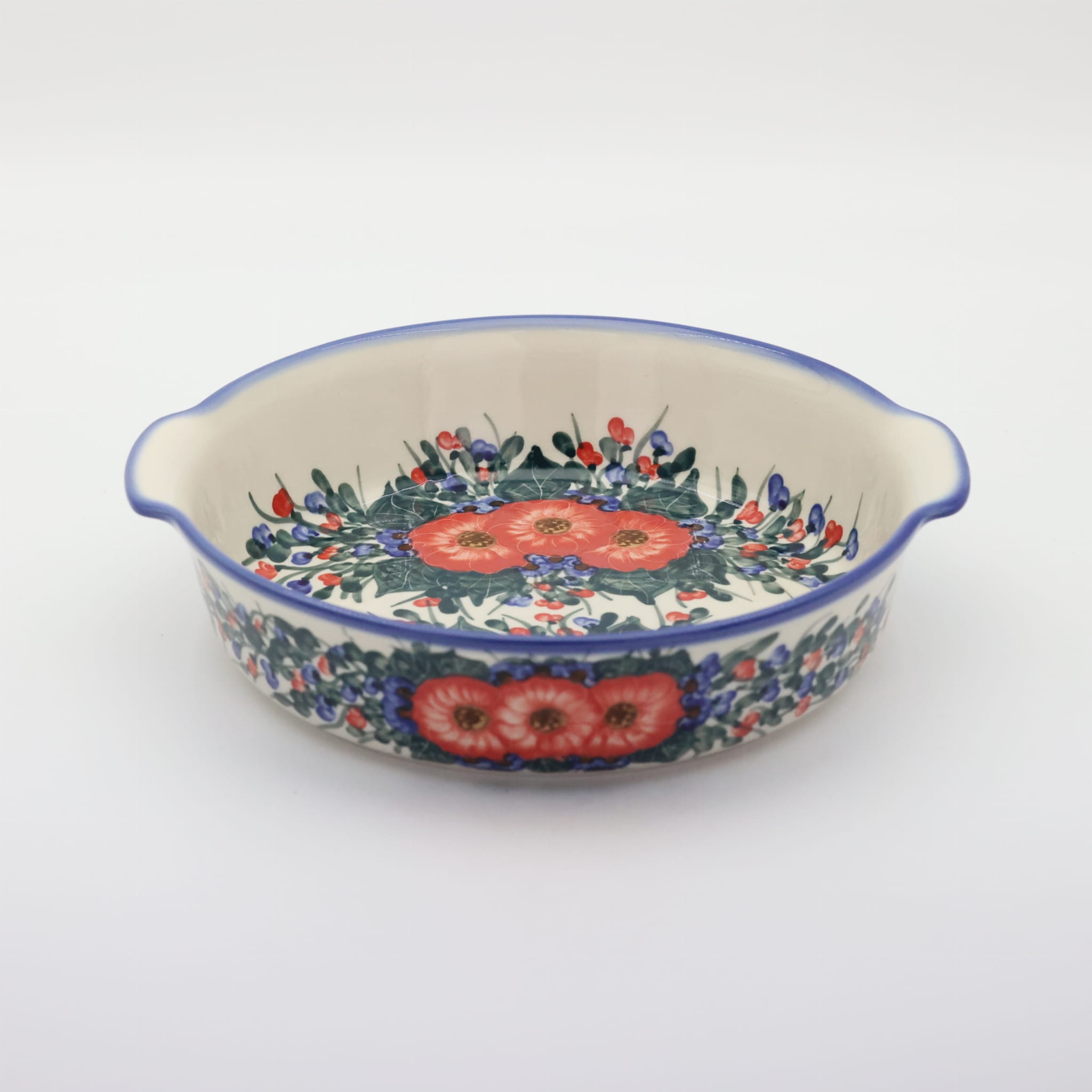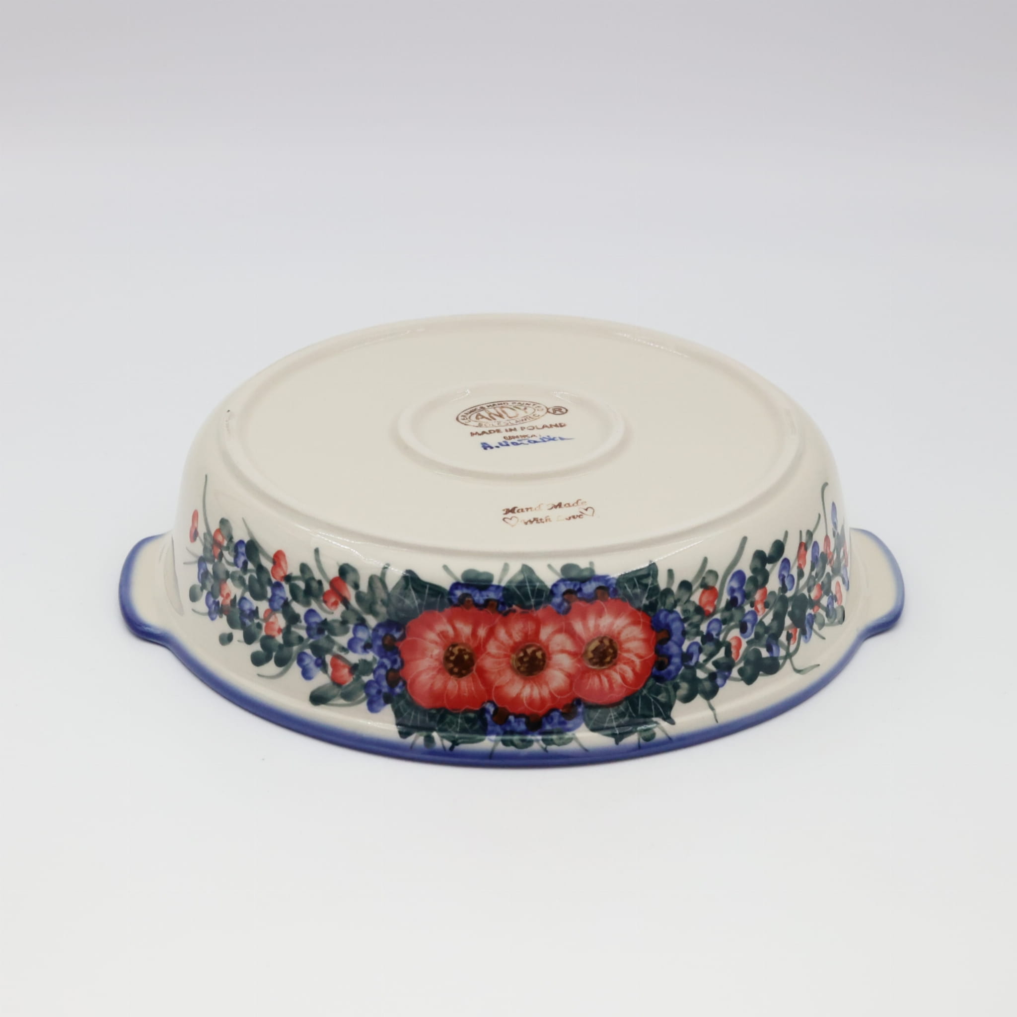 Bolesławiecki ceramiczny półmisek z uszami o szerokości 29 cm. Naczynie ceramiczne do serwowania i zapiekania potraw. Wysunięte na zewnątrz uszy (uchwyty) ułatwiają przenoszenie rozgrzanego naczynia.