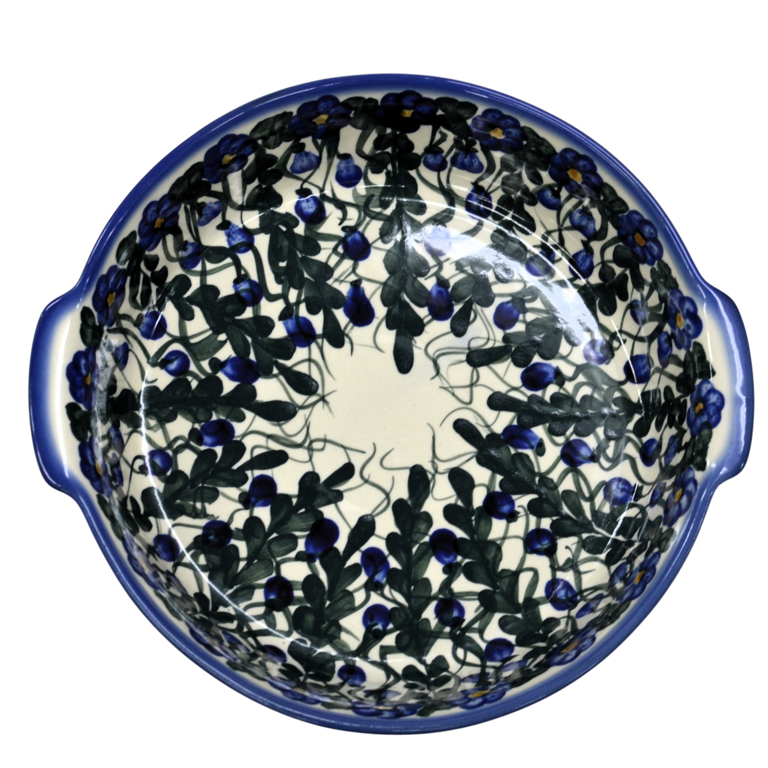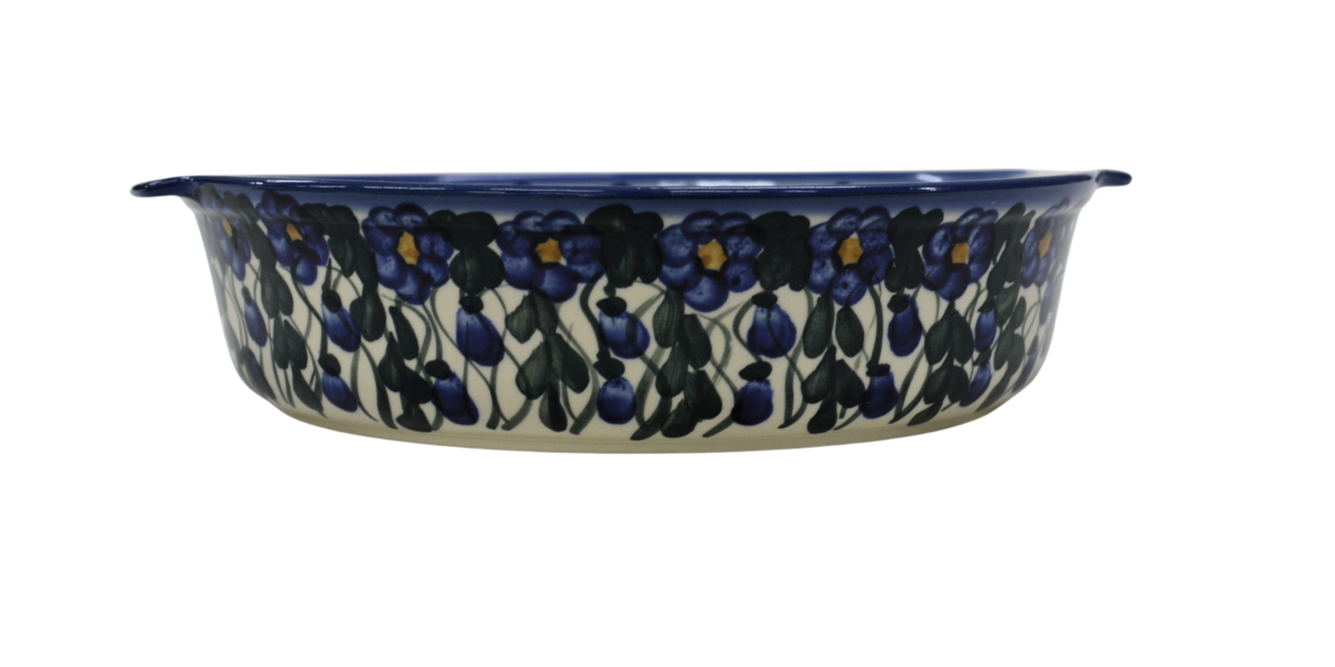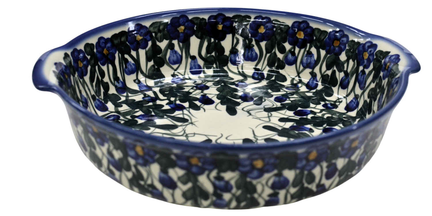Bolesławiecki ceramiczny półmisek z uszami o szerokości 29 cm. Naczynie ceramiczne do serwowania i zapiekania potraw. Wysunięte na zewnątrz uszy (uchwyty) ułatwiają przenoszenie rozgrzanego naczynia.