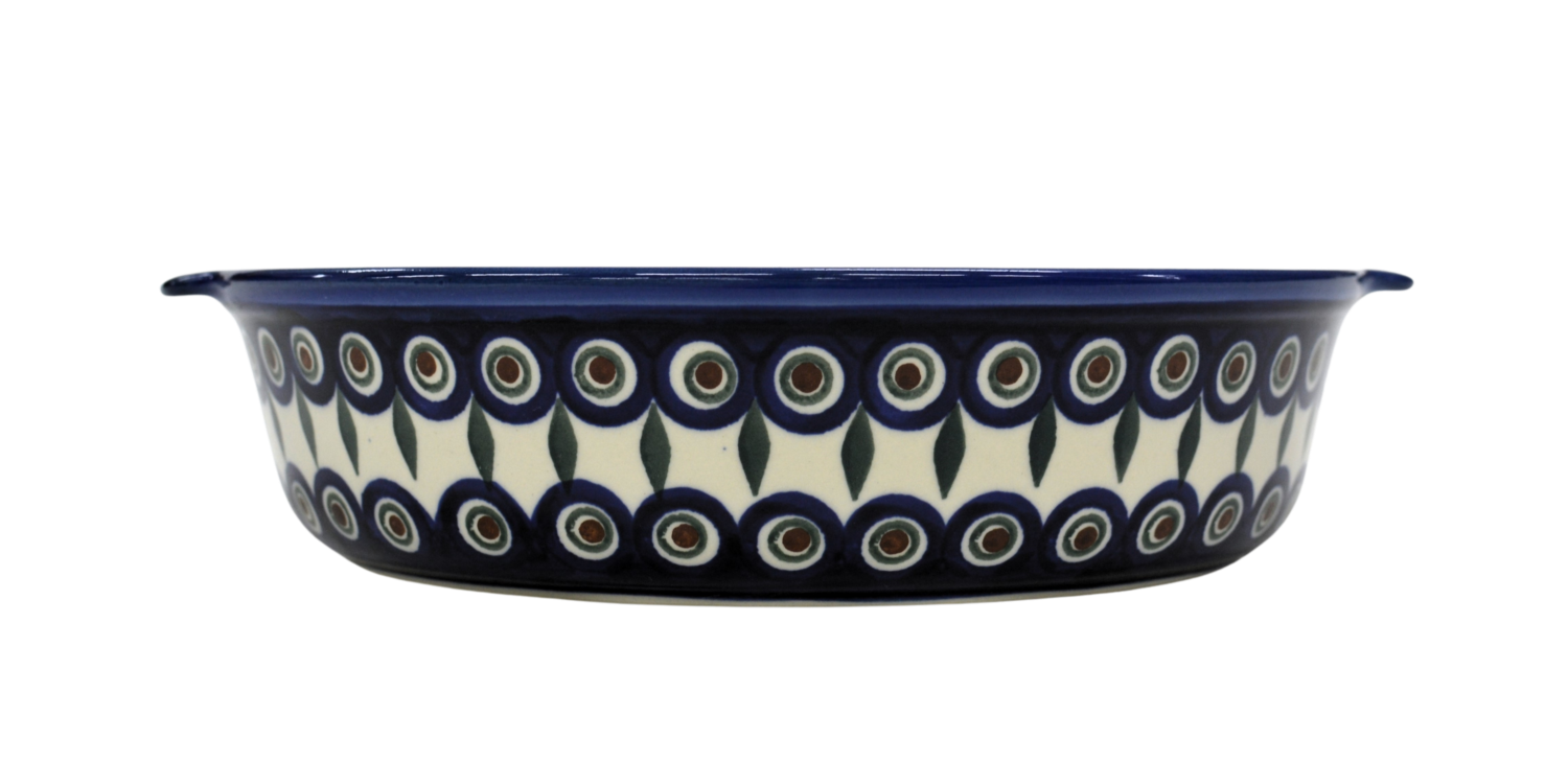 Bolesławiecki ceramiczny półmisek z uszami o szerokości 29 cm. Naczynie ceramiczne do serwowania i zapiekania potraw. Wysunięte na zewnątrz uszy (uchwyty) ułatwiają przenoszenie rozgrzanego naczynia.