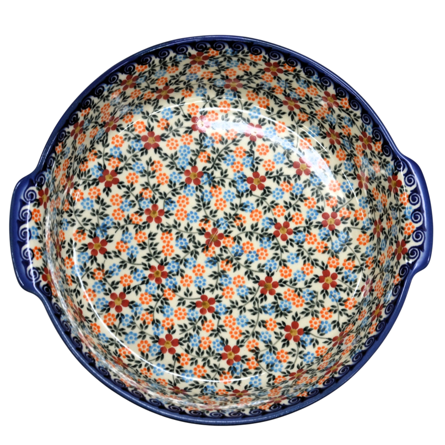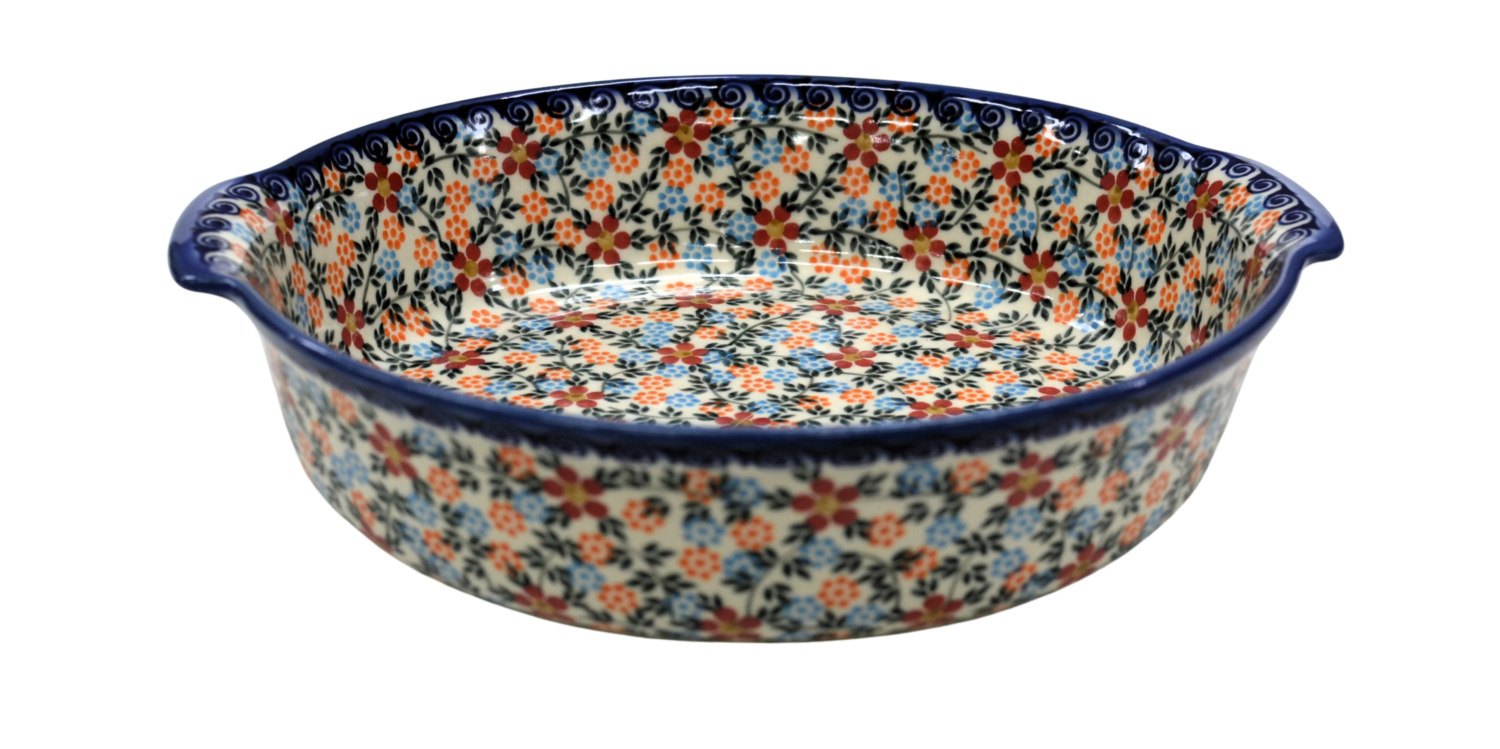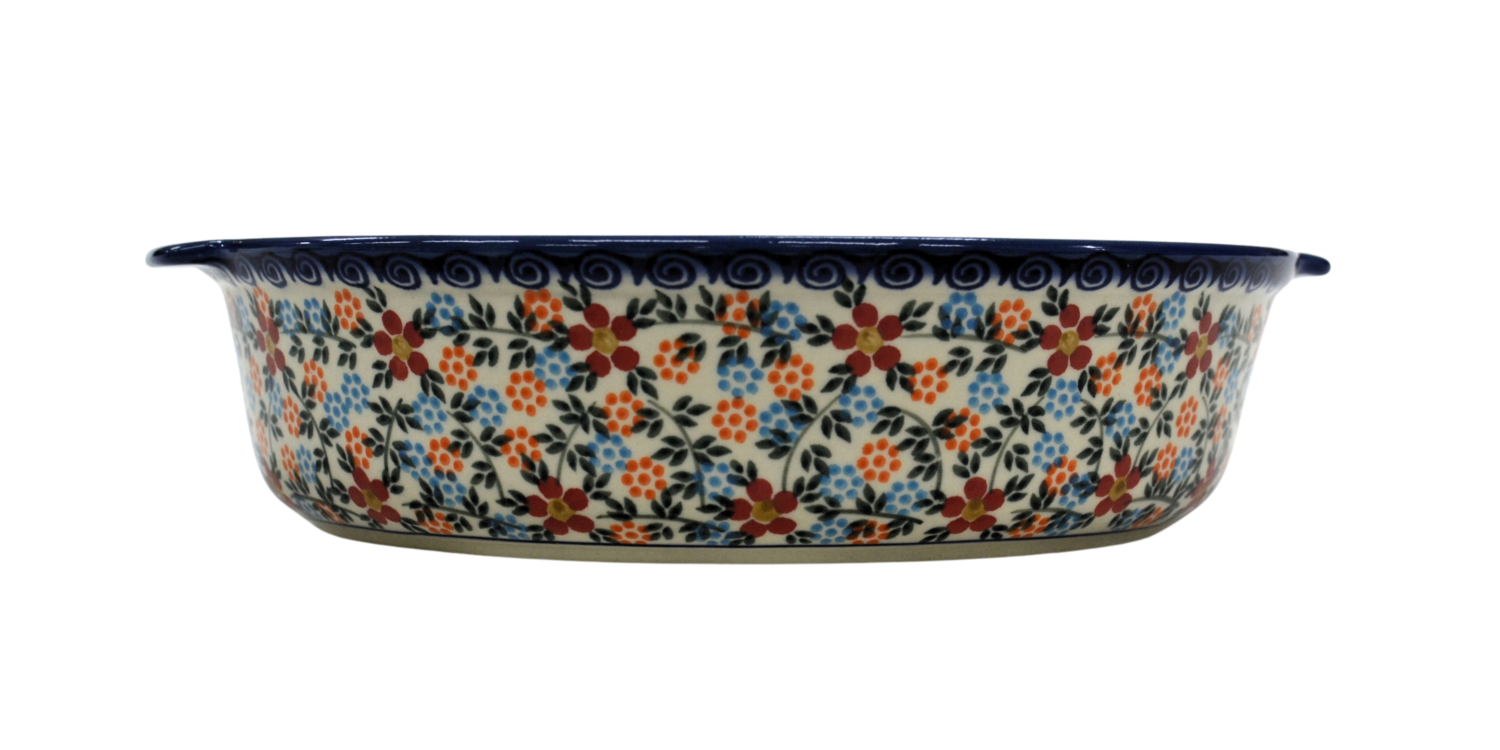Bolesławiecki ceramiczny półmisek z uszami o szerokości 29 cm. Naczynie ceramiczne do serwowania i zapiekania potraw. Wysunięte na zewnątrz uszy (uchwyty) ułatwiają przenoszenie rozgrzanego naczynia.