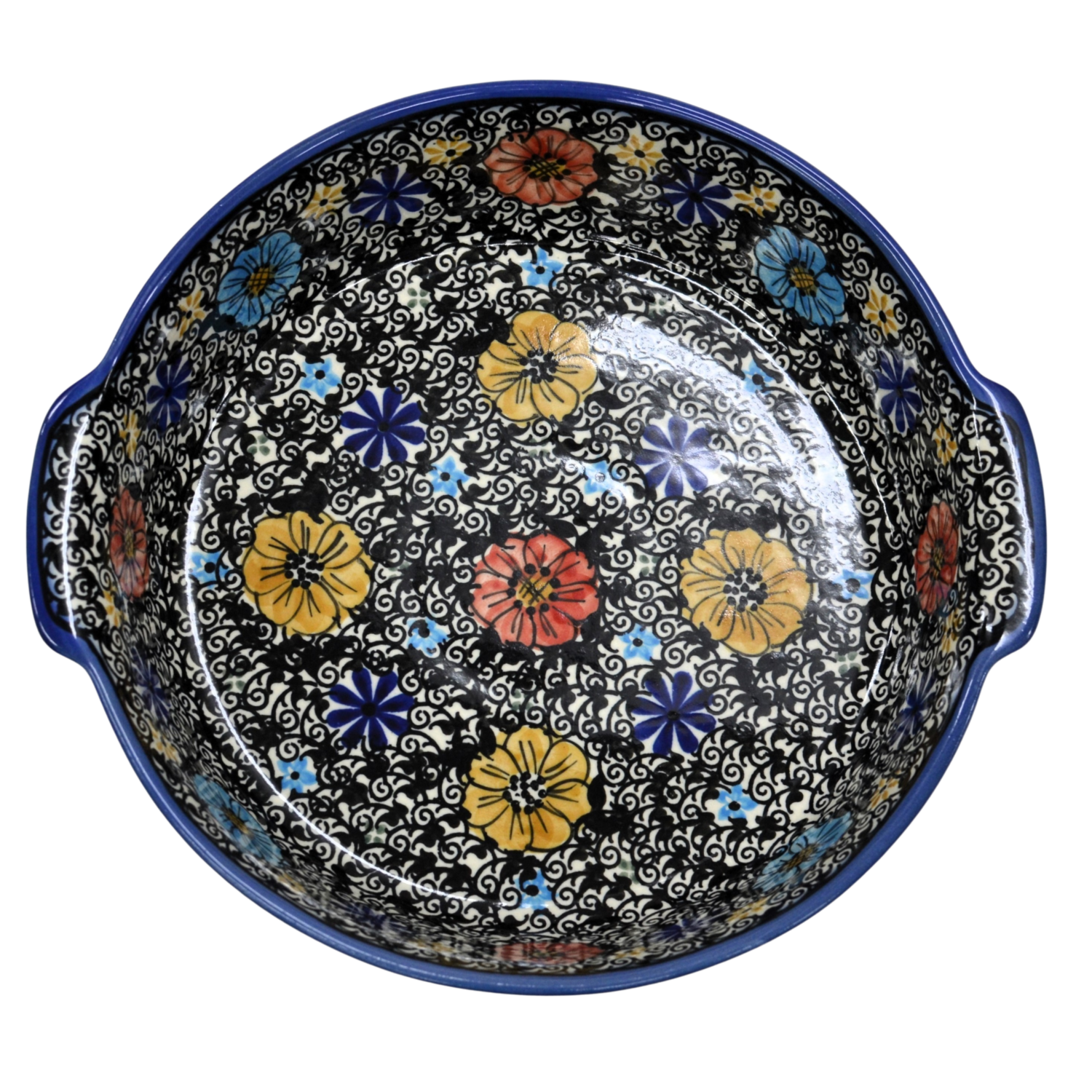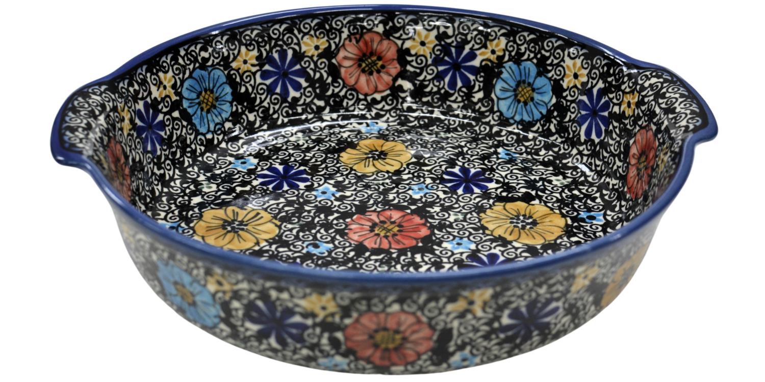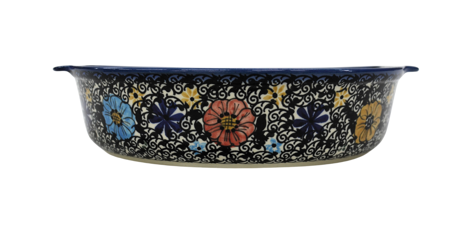 Bolesławiecki ceramiczny półmisek z uszami o szerokości 29 cm. Naczynie ceramiczne do serwowania i zapiekania potraw. Wysunięte na zewnątrz uszy (uchwyty) ułatwiają przenoszenie rozgrzanego naczynia.