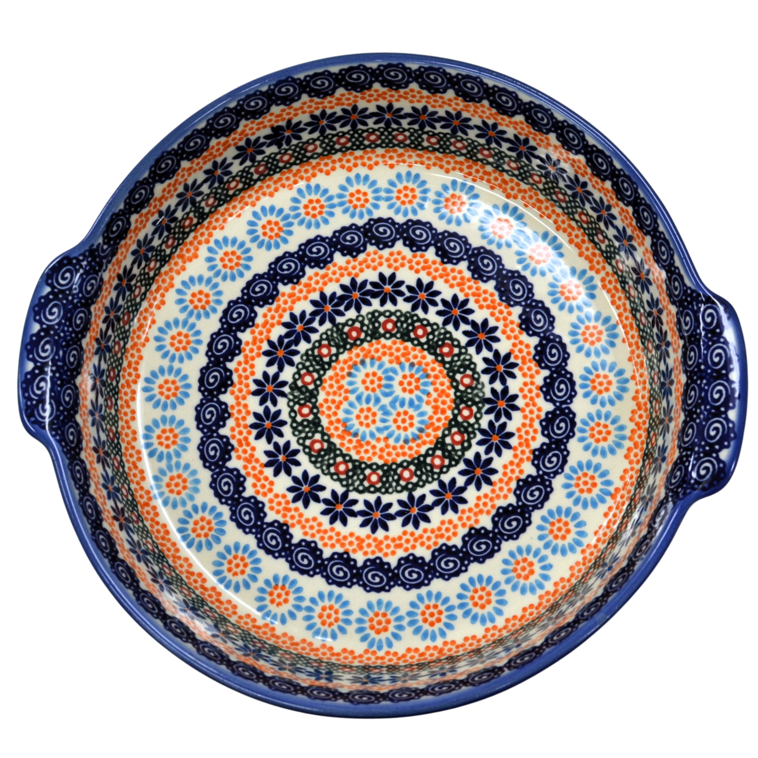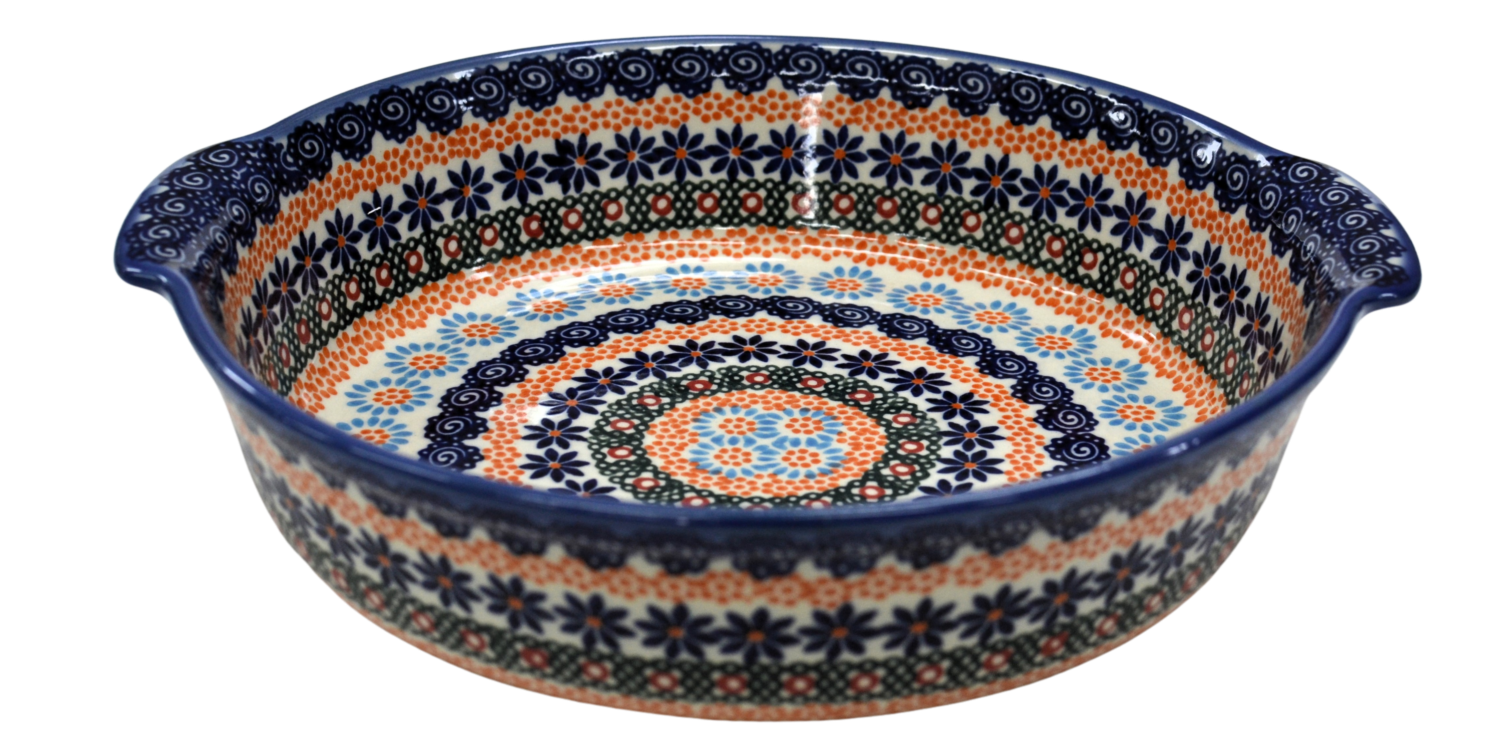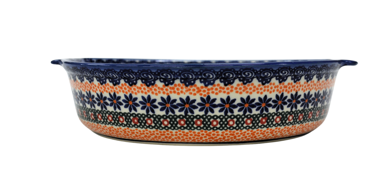 Bolesławiecki ceramiczny półmisek z uszami o szerokości 29 cm. Naczynie ceramiczne do serwowania i zapiekania potraw. Wysunięte na zewnątrz uszy (uchwyty) ułatwiają przenoszenie rozgrzanego naczynia.