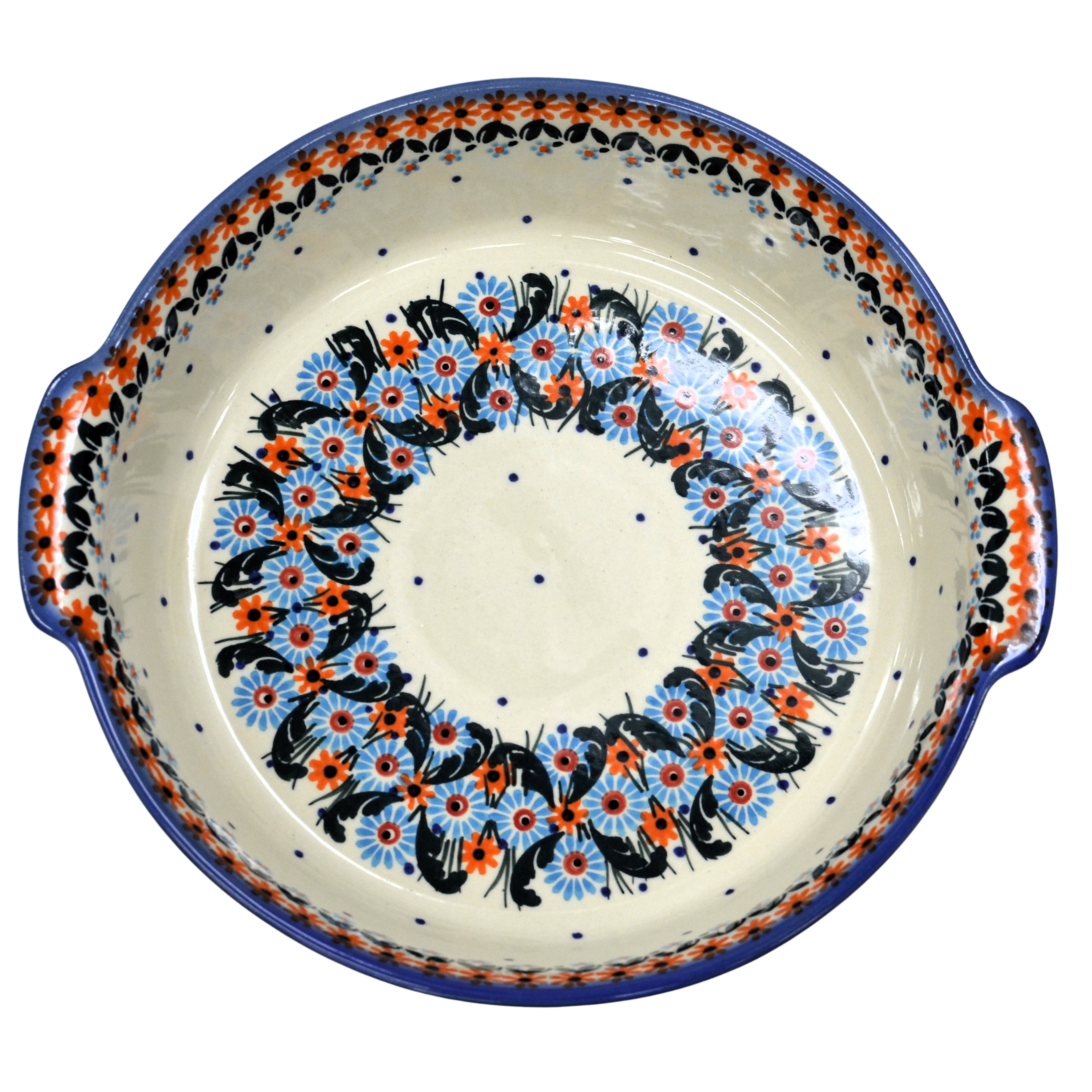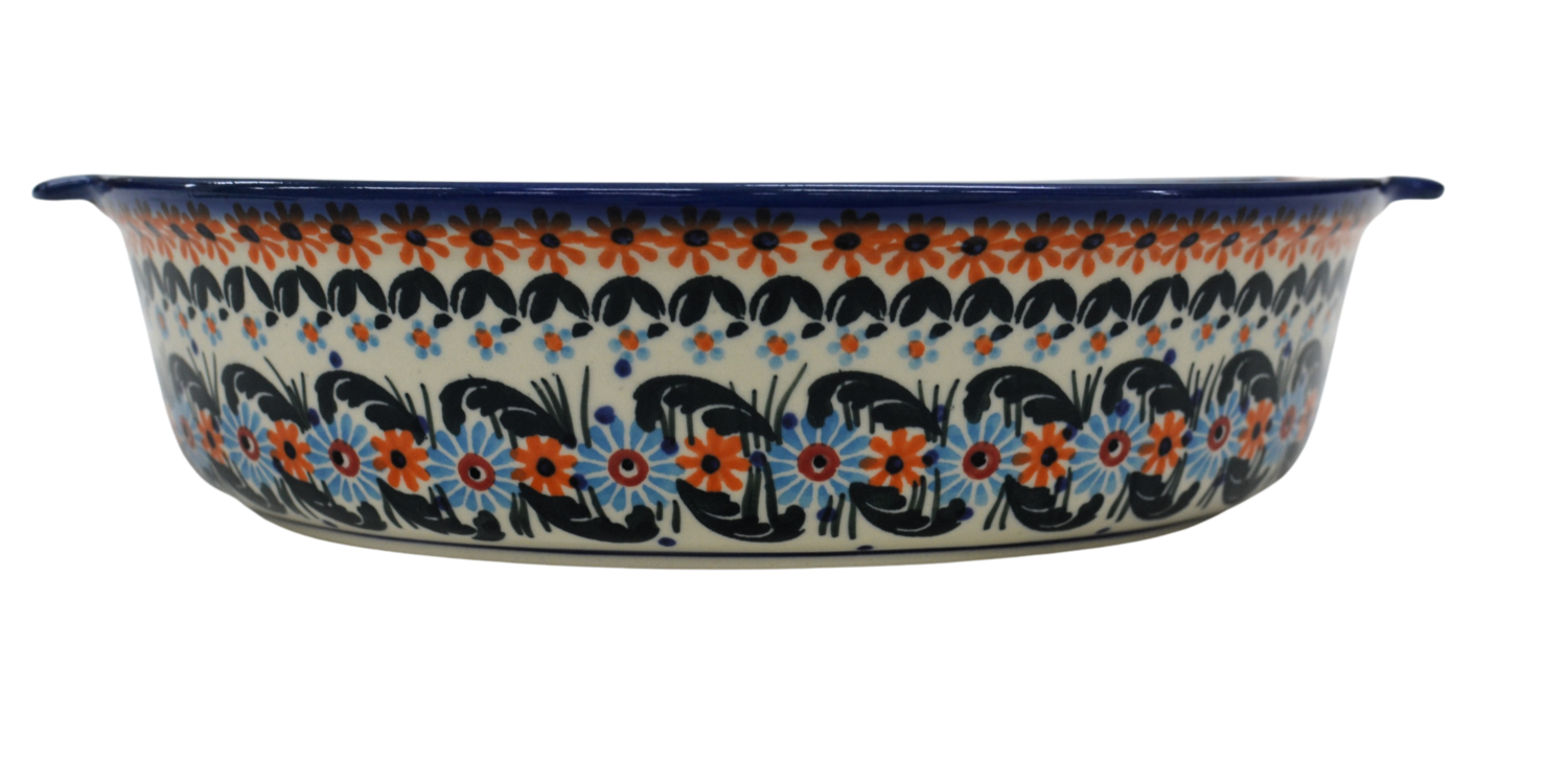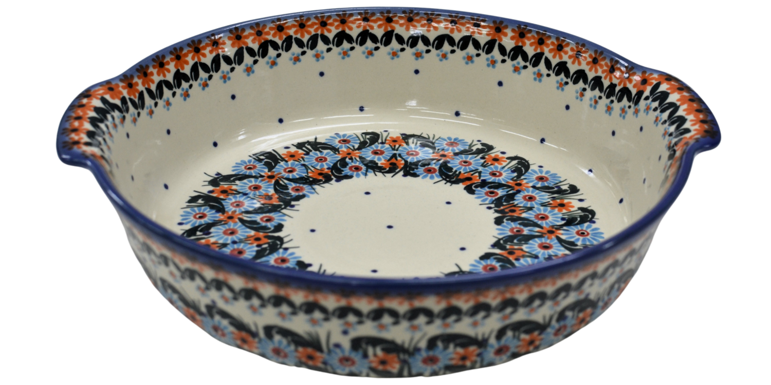 Bolesławiecki ceramiczny półmisek z uszami o szerokości 29 cm. Naczynie ceramiczne do serwowania i zapiekania potraw. Wysunięte na zewnątrz uszy (uchwyty) ułatwiają przenoszenie rozgrzanego naczynia.