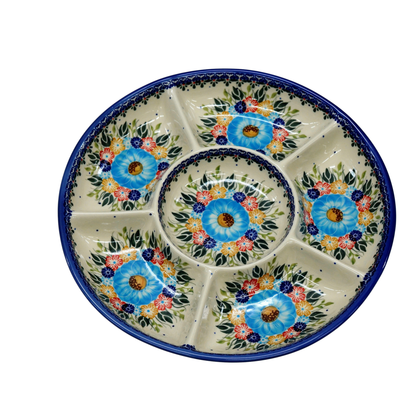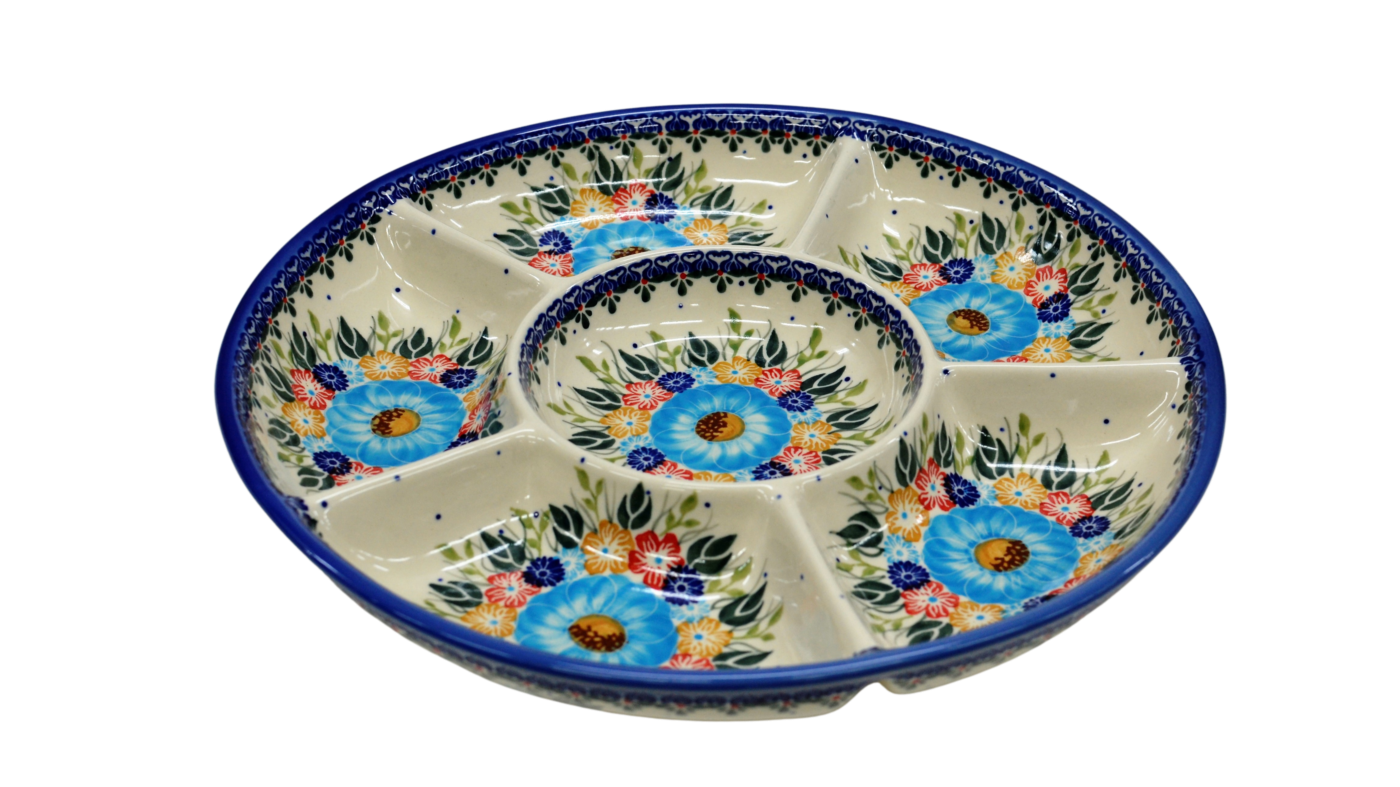 Półmisek okrągły dzielony to wspaniały pomysł na podanie na stół pięknie ułożonych i udekorowanych sałatek, surówek, mięs, ziemniaków, frytek, batatów. Potrawy umieszczone na talerzu mogą zostać ułożone w oryginalny sposób, oddzielone od siebie. Na półmisku można poukładać kolorowe sałatki, mięsa, warzywa. Wyjątkowy stół, oryginalnie podane potrawy, podczas Twojego przyjęcia, dzięki ręcznie wykonanym ceramicznym naczyniom ze zdobieniom podszkliwnym. Piękne, ręcznie dekorowane i glazurowane, talerze ceramiczne zdobione są różnokolorowymi wzorami, zieleń, czerwień, brąz, bolesławiecki kobalt, to to co dodaje wyjątkowej unikatowości i dyskretnej elegancji naczyń ceramicznych. Oryginalny talerz z Bolesławca, miasta ceramiki, niesamowicie wyróżni na stole tradycyjne polskie potrawy i te powstałe na wzór potraw kuchni całego świata.