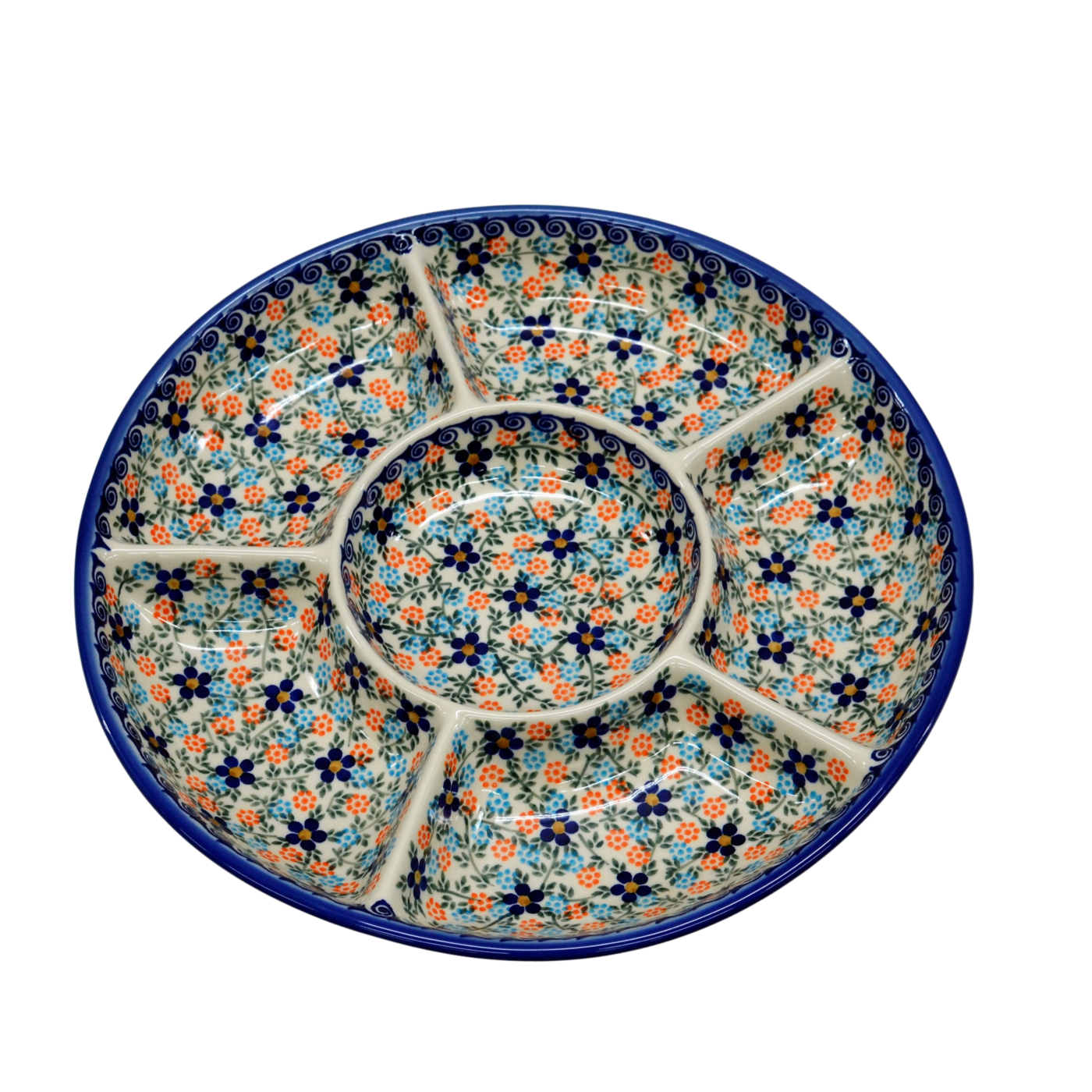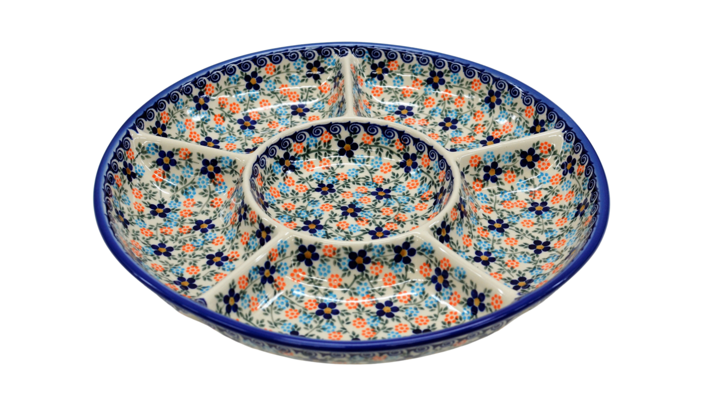 Półmisek okrągły dzielony to wspaniały pomysł na podanie na stół pięknie ułożonych i udekorowanych sałatek, surówek, mięs, ziemniaków, frytek, batatów. Potrawy umieszczone na talerzu mogą zostać ułożone w oryginalny sposób, oddzielone od siebie. Na półmisku można poukładać kolorowe sałatki, mięsa, warzywa. Wyjątkowy stół, oryginalnie podane potrawy, podczas Twojego przyjęcia, dzięki ręcznie wykonanym ceramicznym naczyniom ze zdobieniom podszkliwnym. Piękne, ręcznie dekorowane i glazurowane, talerze ceramiczne zdobione są różnokolorowymi wzorami, zieleń, czerwień, brąz, bolesławiecki kobalt, to to co dodaje wyjątkowej unikatowości i dyskretnej elegancji naczyń ceramicznych. Oryginalny talerz z Bolesławca, miasta ceramiki, niesamowicie wyróżni na stole tradycyjne polskie potrawy i te powstałe na wzór potraw kuchni całego świata.