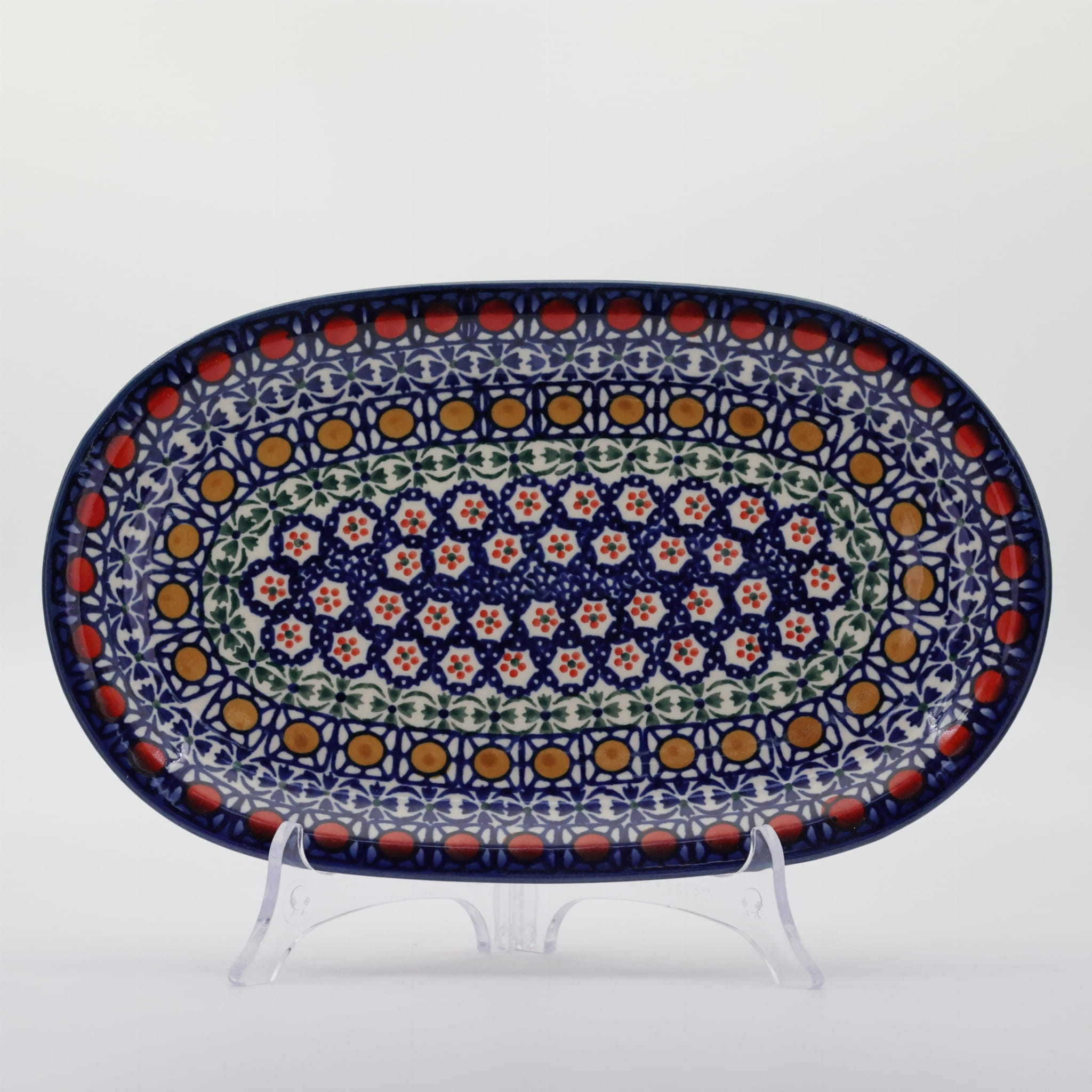 Półmisek zdobi charakterystyczne, ręcznie malowane wzory, typowe dla bolesławieckiej ceramiki, które od lat cieszą się uznaniem na całym świecie. Oryginalność i kunszt wykonania sprawiają, że każdy egzemplarz jest niepowtarzalny i stanowi prawdziwe dzieło sztuki użytkowej.