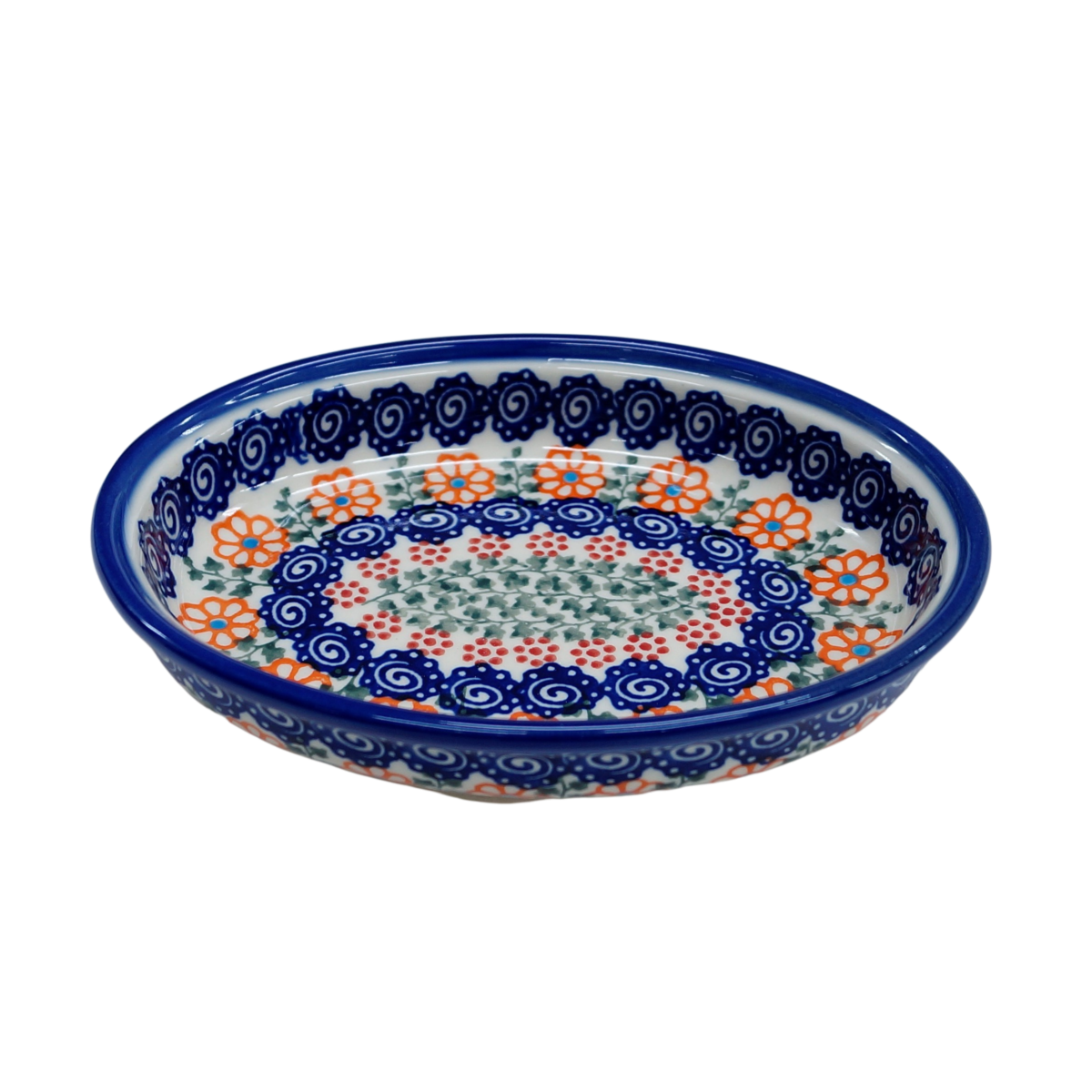Półmiski ceramiczne są szeroko rozwinięta gamą naczyń ceramicznych w naszej ofercie. Znajdują najczęstsze zastosowanie podczas podawania posiłków i w trakcie ich przygotowywania. Wśród wielu kształtów i wielkości naczyń ceramicznych wyróżnić możemy półmisek owalny mały o charakterystycznym kształcie owalu lub niektórych zwanych spłaszczonym. Swoje zastosowanie odnajdzie podczas zapiekania przeróżnych potraw warzywnych i mięsnych, będzie rewelacyjnie służyć do zapiekania sera feta czy podawania pojedynczych potraw na gorącym półmisku. Stosunkowo wysoki rant pozwala na użycie go do podania dań otoczonych wszelkimi sosami w tym pomidorowym czy pieczarkowym lub grzybowym. Przez nas stosowany jest często do podania budyniu czy znakomitego crème brulee o słodkim i przyjemnym smaku. Ceramika bolesławiecka jest bardzo charakterystycznym produktem na rynku rękodzieła artystycznego, oryginalne dekoracje ukryte pod szkliwem, które nadaje wysokiej jakości i trwałości wyrobów ceramicznych. Gama produktów jest bardzo bogata a do tego realizujemy zamówienia indywidualne wg potrzeb naszych klientów.