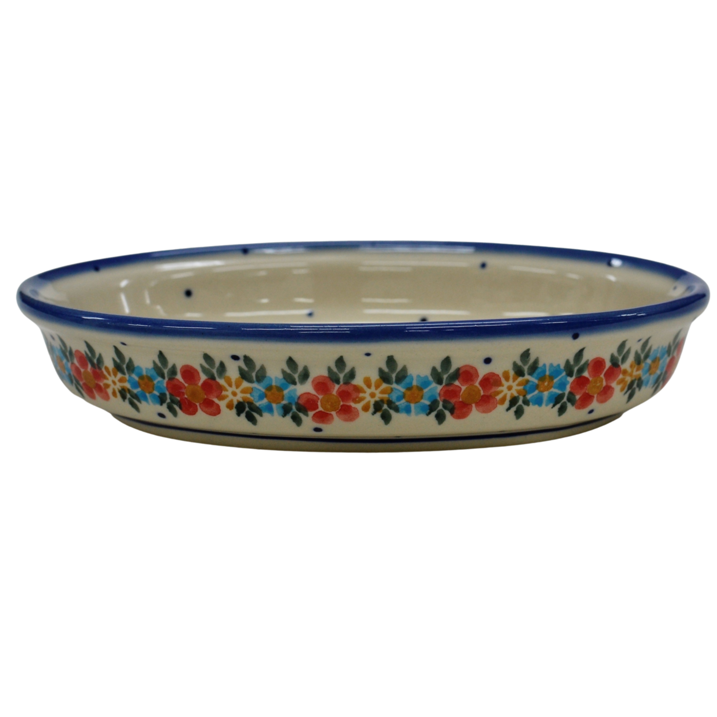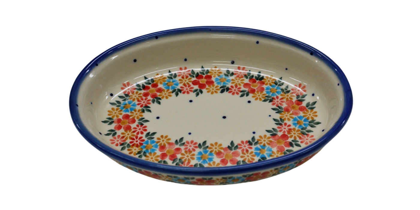 Półmiski ceramiczne są szeroko rozwinięta gamą naczyń ceramicznych w naszej ofercie. Znajdują najczęstsze zastosowanie podczas podawania posiłków i w trakcie ich przygotowywania. Wśród wielu kształtów i wielkości naczyń ceramicznych wyróżnić możemy półmisek owalny mały o charakterystycznym kształcie owalu lub niektórych zwanych spłaszczonym. Swoje zastosowanie odnajdzie podczas zapiekania przeróżnych potraw warzywnych i mięsnych, będzie rewelacyjnie służyć do zapiekania sera feta czy podawania pojedynczych potraw na gorącym półmisku. Stosunkowo wysoki rant pozwala na użycie go do podania dań otoczonych wszelkimi sosami w tym pomidorowym czy pieczarkowym lub grzybowym. Przez nas stosowany jest często do podania budyniu czy znakomitego crème brulee o słodkim i przyjemnym smaku. Ceramika bolesławiecka jest bardzo charakterystycznym produktem na rynku rękodzieła artystycznego, oryginalne dekoracje ukryte pod szkliwem, które nadaje wysokiej jakości i trwałości wyrobów ceramicznych. Gama produktów jest bardzo bogata a do tego realizujemy zamówienia indywidualne wg potrzeb naszych klientów.