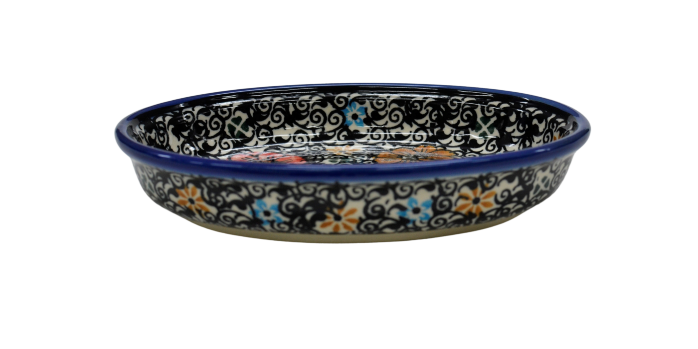 Półmiski ceramiczne są szeroko rozwinięta gamą naczyń ceramicznych w naszej ofercie. Znajdują najczęstsze zastosowanie podczas podawania posiłków i w trakcie ich przygotowywania. Wśród wielu kształtów i wielkości naczyń ceramicznych wyróżnić możemy półmisek owalny mały o charakterystycznym kształcie owalu lub niektórych zwanych spłaszczonym. Swoje zastosowanie odnajdzie podczas zapiekania przeróżnych potraw warzywnych i mięsnych, będzie rewelacyjnie służyć do zapiekania sera feta czy podawania pojedynczych potraw na gorącym półmisku. Stosunkowo wysoki rant pozwala na użycie go do podania dań otoczonych wszelkimi sosami w tym pomidorowym czy pieczarkowym lub grzybowym. Przez nas stosowany jest często do podania budyniu czy znakomitego crème brulee o słodkim i przyjemnym smaku. Ceramika bolesławiecka jest bardzo charakterystycznym produktem na rynku rękodzieła artystycznego, oryginalne dekoracje ukryte pod szkliwem, które nadaje wysokiej jakości i trwałości wyrobów ceramicznych. Gama produktów jest bardzo bogata a do tego realizujemy zamówienia indywidualne wg potrzeb naszych klientów.