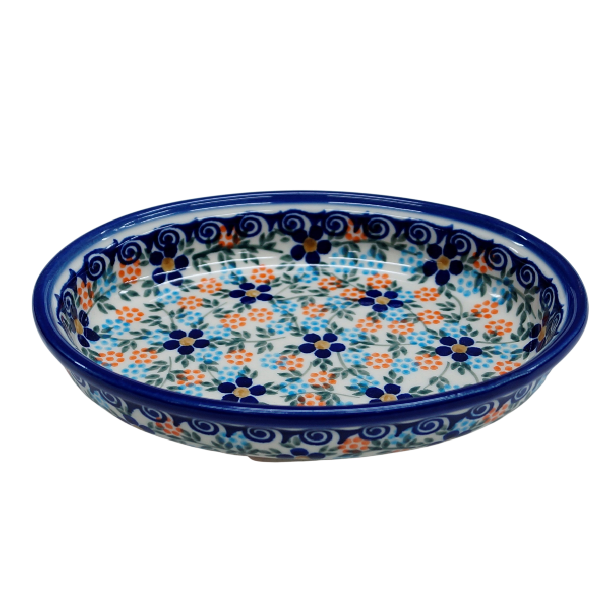 Półmiski ceramiczne są szeroko rozwinięta gamą naczyń ceramicznych w naszej ofercie. Znajdują najczęstsze zastosowanie podczas podawania posiłków i w trakcie ich przygotowywania. Wśród wielu kształtów i wielkości naczyń ceramicznych wyróżnić możemy półmisek owalny mały o charakterystycznym kształcie owalu lub niektórych zwanych spłaszczonym. Swoje zastosowanie odnajdzie podczas zapiekania przeróżnych potraw warzywnych i mięsnych, będzie rewelacyjnie służyć do zapiekania sera feta czy podawania pojedynczych potraw na gorącym półmisku. Stosunkowo wysoki rant pozwala na użycie go do podania dań otoczonych wszelkimi sosami w tym pomidorowym czy pieczarkowym lub grzybowym. Przez nas stosowany jest często do podania budyniu czy znakomitego crème brulee o słodkim i przyjemnym smaku. Ceramika bolesławiecka jest bardzo charakterystycznym produktem na rynku rękodzieła artystycznego, oryginalne dekoracje ukryte pod szkliwem, które nadaje wysokiej jakości i trwałości wyrobów ceramicznych. Gama produktów jest bardzo bogata a do tego realizujemy zamówienia indywidualne wg potrzeb naszych klientów.