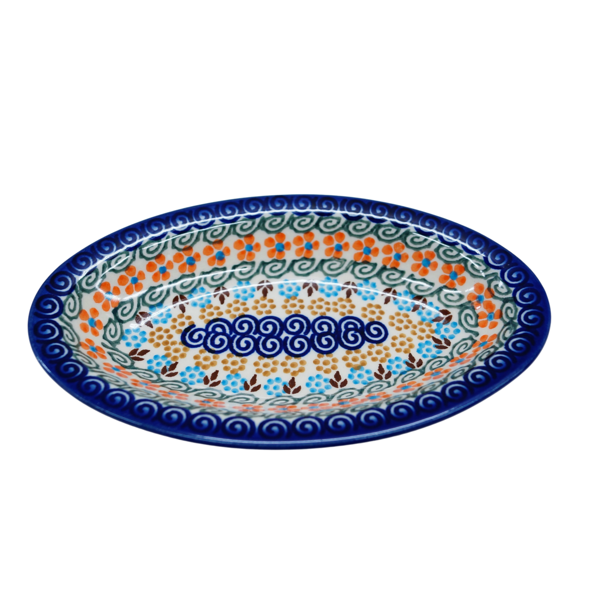 Piękny, ręcznie zdobiony półmisek ceramiczny o długości 18,4 cm i szerokości 11 cm.