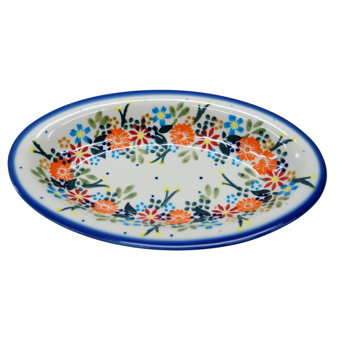 Piękny, ręcznie zdobiony półmisek ceramiczny o długości 18,4 cm i szerokości 11 cm.