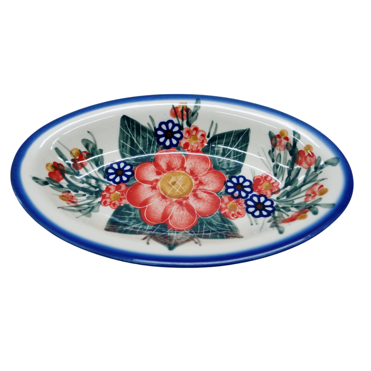 Piękny, ręcznie zdobiony półmisek ceramiczny o długości 18,4 cm i szerokości 11 cm.