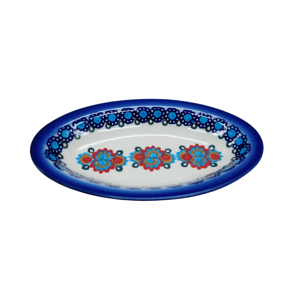 Piękny, ręcznie zdobiony półmisek ceramiczny o długości 18,4 cm i szerokości 11 cm.
