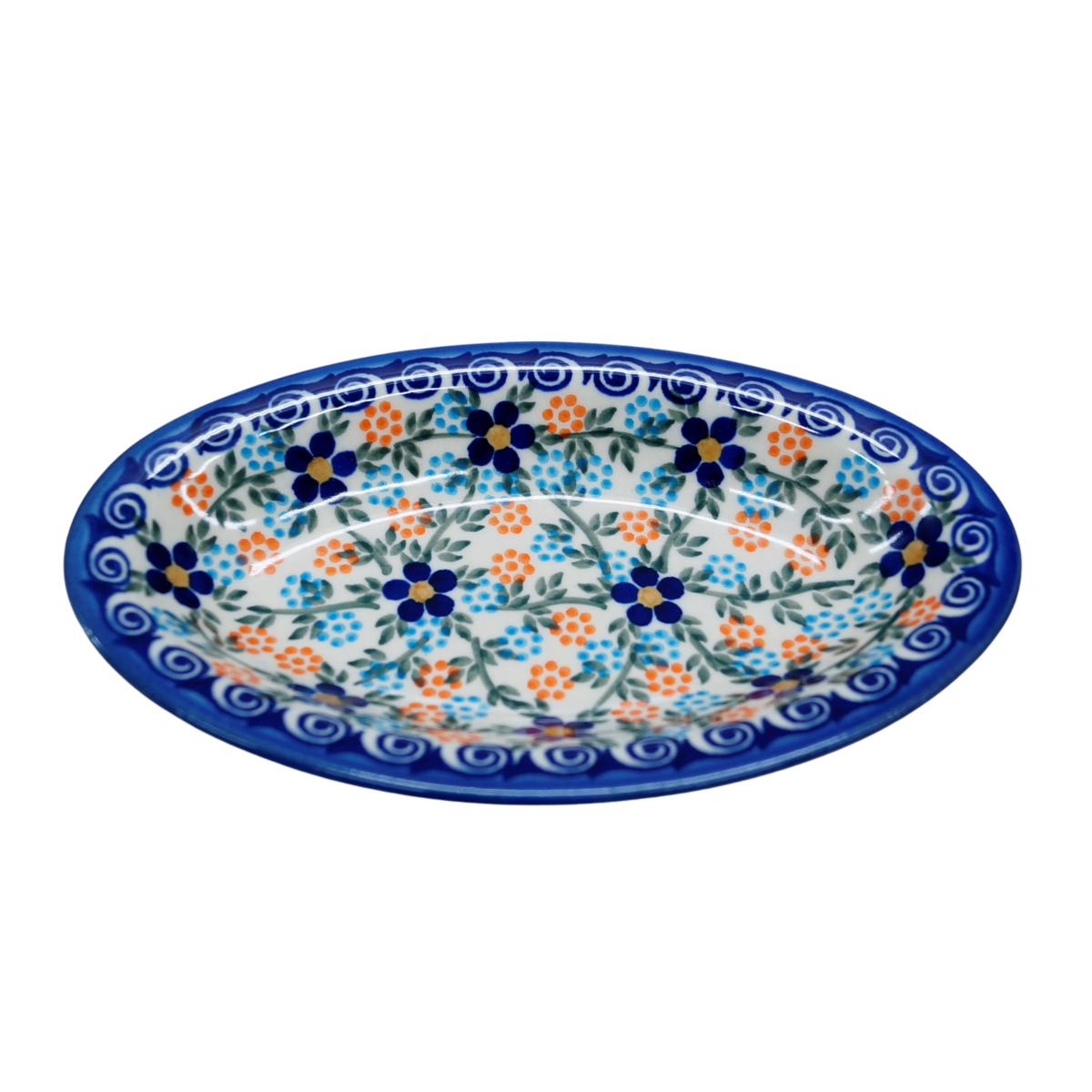 Piękny, ręcznie zdobiony półmisek ceramiczny o długości 18,4 cm i szerokości 11 cm.