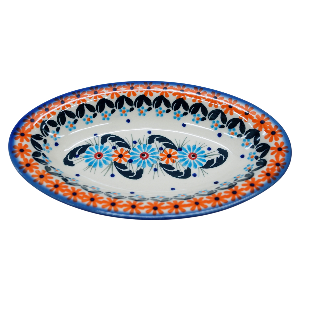 Piękny, ręcznie zdobiony półmisek ceramiczny o długości 18,4 cm i szerokości 11 cm.