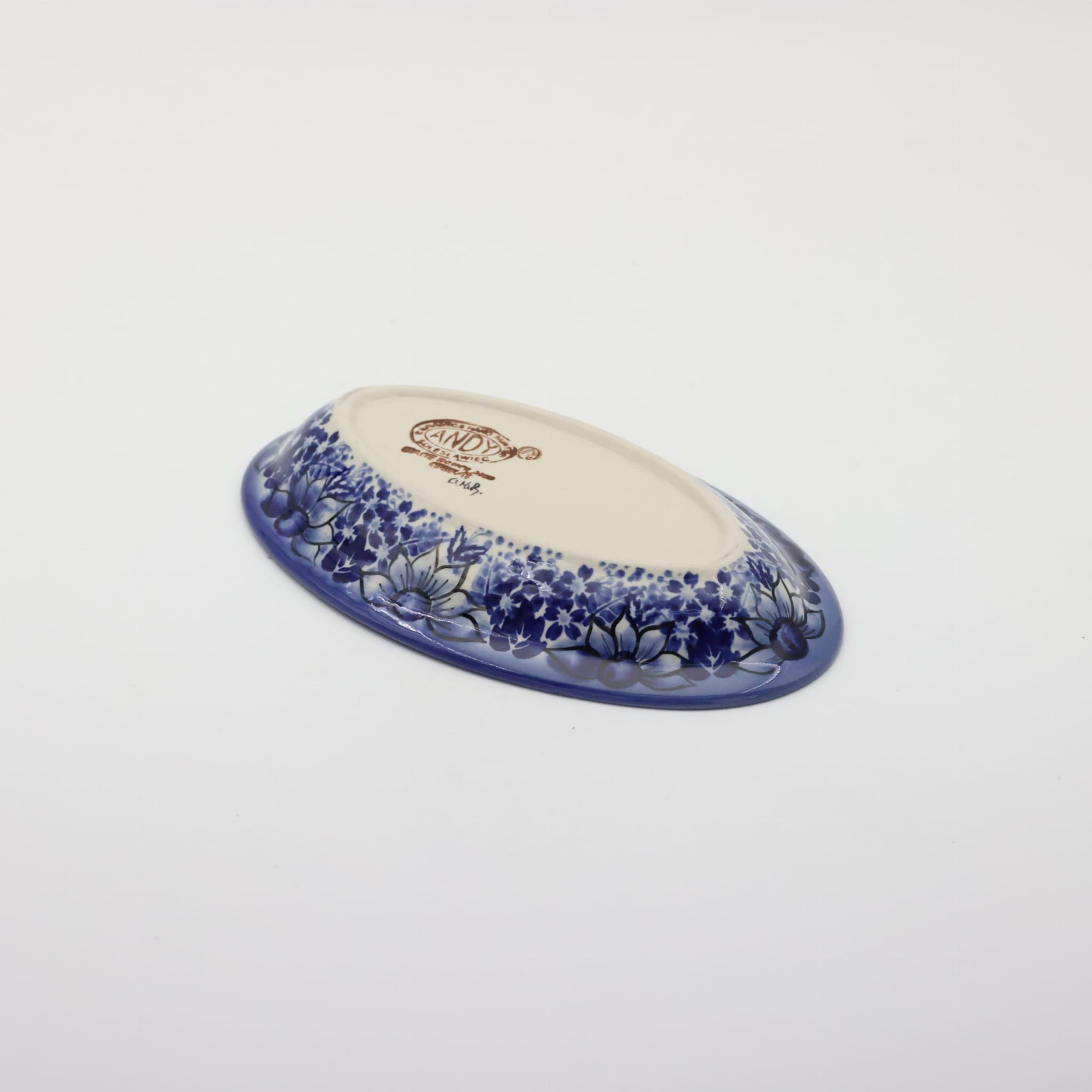 Piękny, ręcznie zdobiony półmisek ceramiczny o długości 21,1 cm i szerokości 12,5 cm.