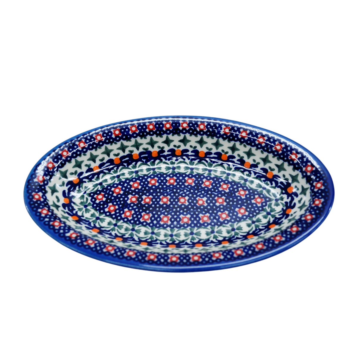Piękny, ręcznie zdobiony półmisek ceramiczny o długości 21,1 cm i szerokości 12,5 cm.