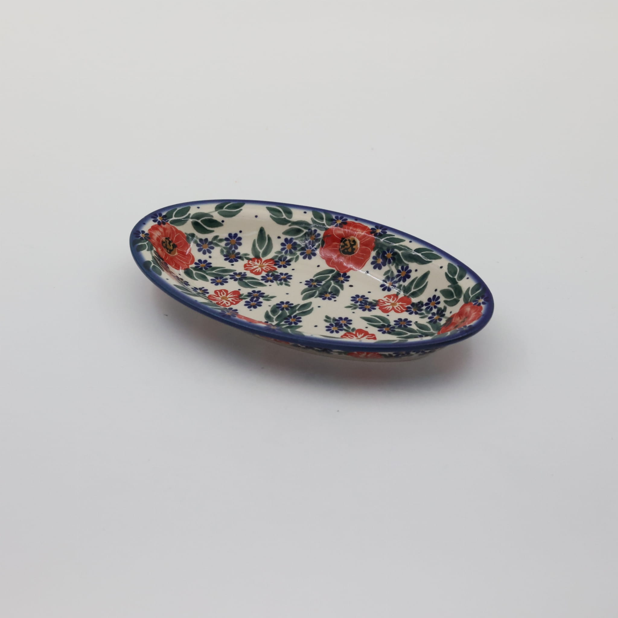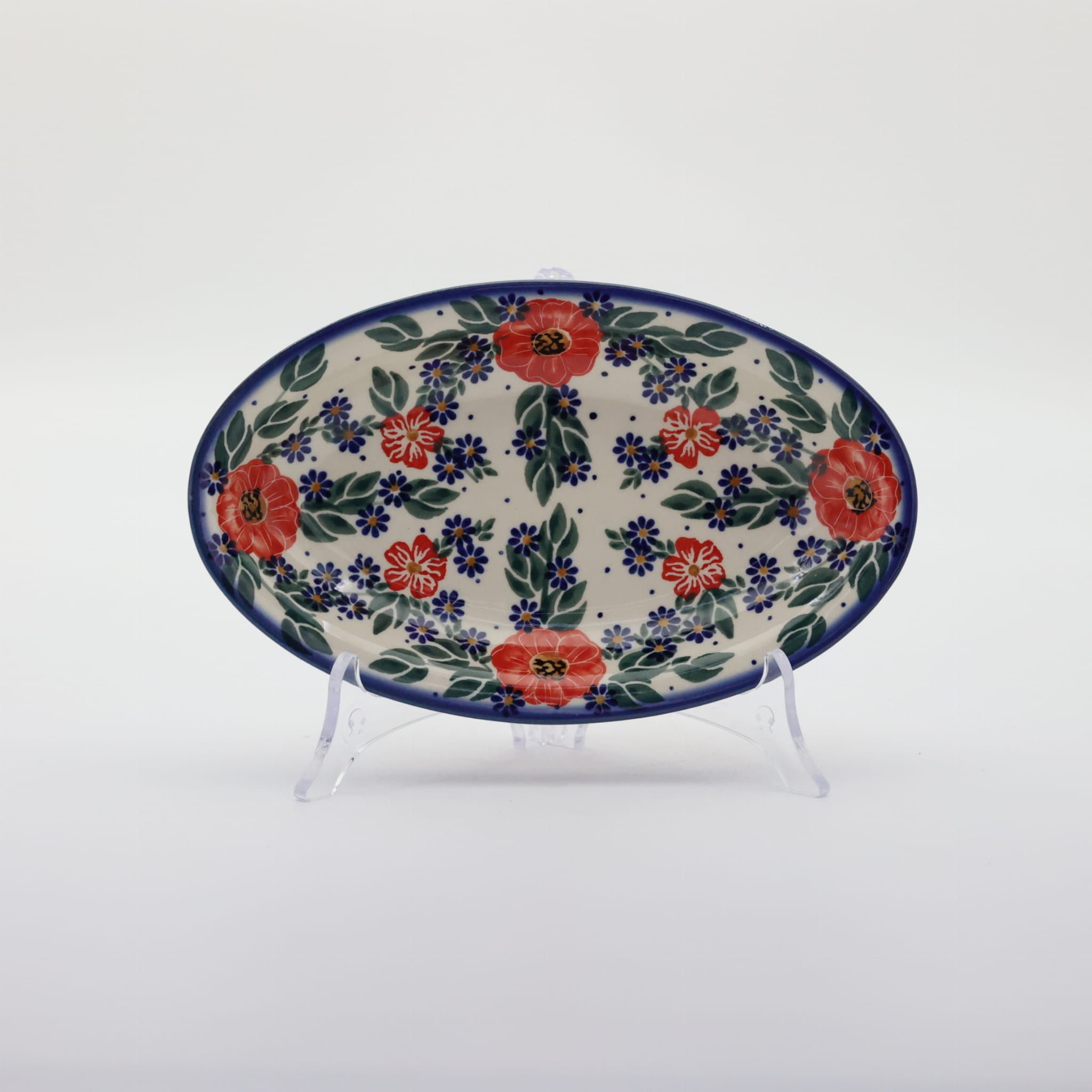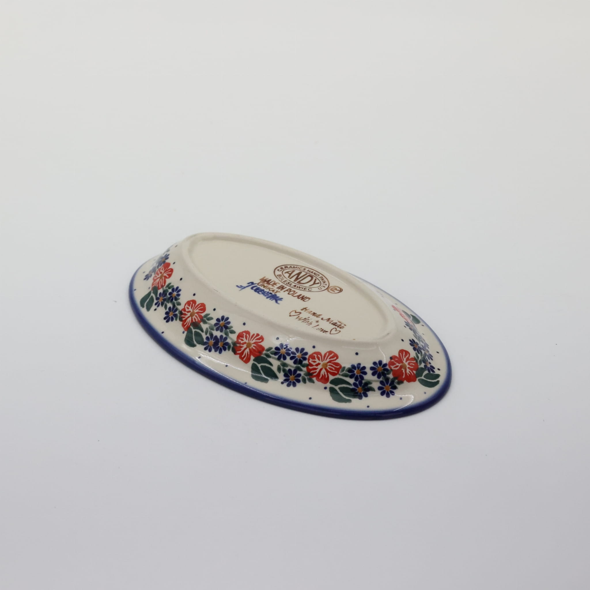 Piękny, ręcznie zdobiony półmisek ceramiczny o długości 21,1 cm i szerokości 12,5 cm.