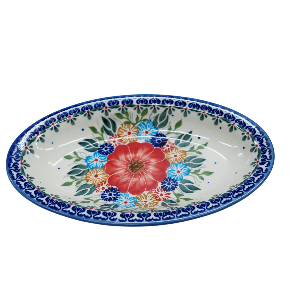 Piękny, ręcznie zdobiony półmisek ceramiczny o długości 21,1 cm i szerokości 12,5 cm.