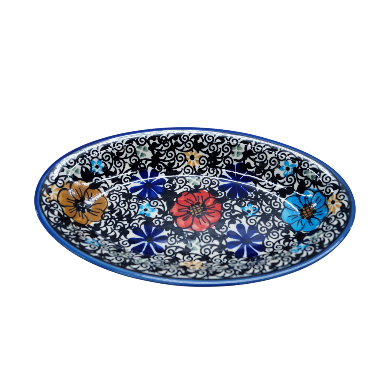 Piękny, ręcznie zdobiony półmisek ceramiczny o długości 21,1 cm i szerokości 12,5 cm.
