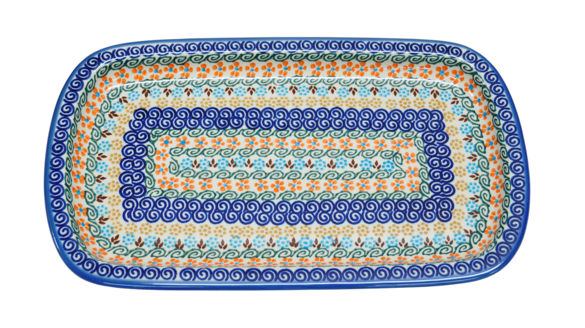 Półmisek prostokątny CH możesz wykorzystać jako naczynie na wędliny, pieczywo, pieczone mięsa czy podanie owoców, które idealnie wkomponują się w liczne kwiatowe motywy zdobień ceramiki bolesławieckiej.