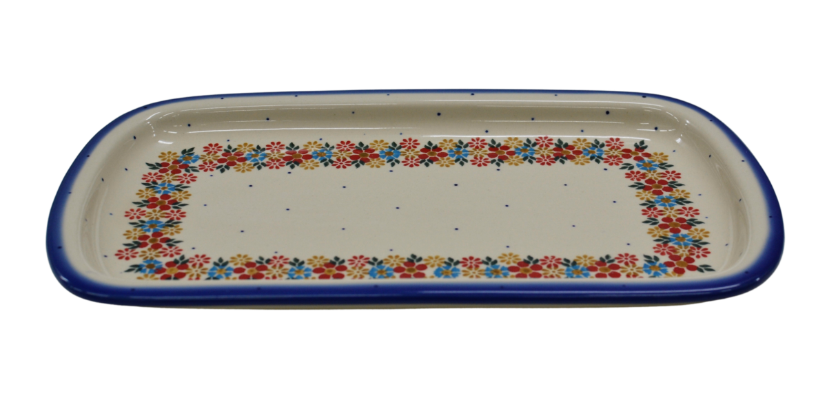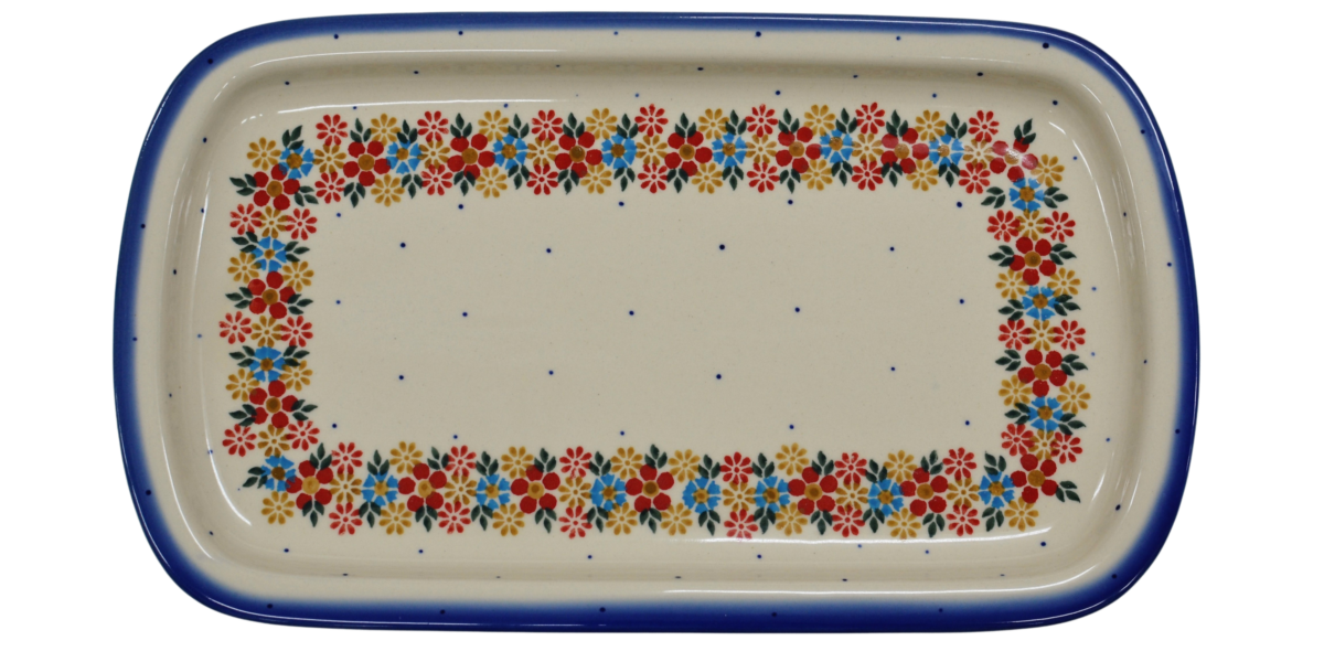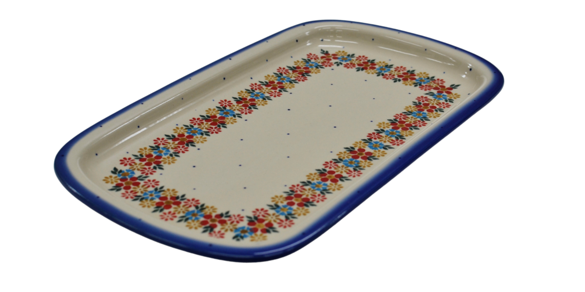 Półmisek prostokątny CH możesz wykorzystać jako naczynie na wędliny, pieczywo, pieczone mięsa czy podanie owoców, które idealnie wkomponują się w liczne kwiatowe motywy zdobień ceramiki bolesławieckiej.
