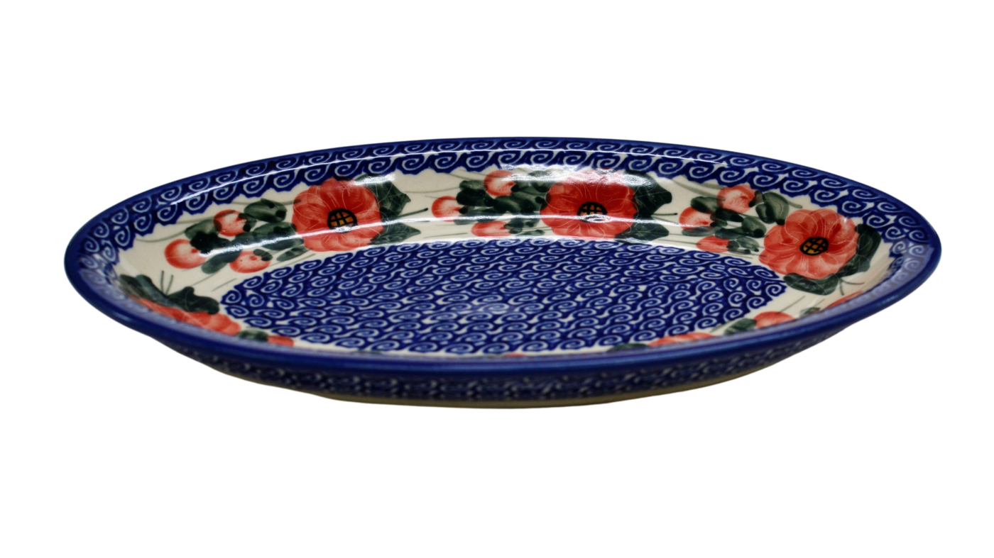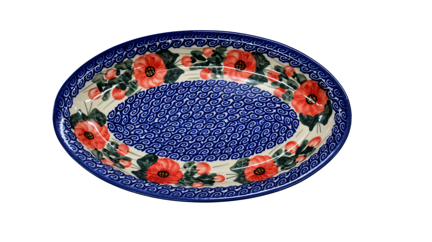 Duży, rozłożysty i przy tym elegancki półmisek ceramiczny w kształcie owalu, o szerokim zastosowaniu w kuchni, salonie czy podczas posiłków w jadalni. Jeszcze gorący i pachnący zapiekany kawał udźca owczego podany na tym naczyniu z pewnością ułatwi podanie posiłku. Nie zliczone są potrawy, które mogą zostać podane na naczyniach ceramiki bolesławieckiej. Pieczony indyk, rozpływająca się w ustach o chrupiącej skórce, zarumieniona kaczka z jabłkiem, pieczony karczek czy soczysty kawał dzika z przyprawami oraz wiele więcej potraw, które zdecydowanie z ogromną łatwością zostaną podane na stole podczas przyjęcia urodzinowego, imieninowego czy świąt.