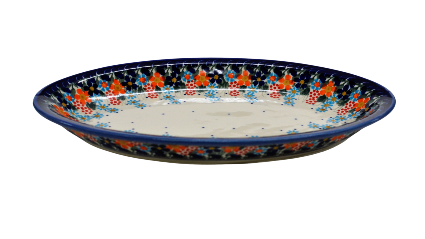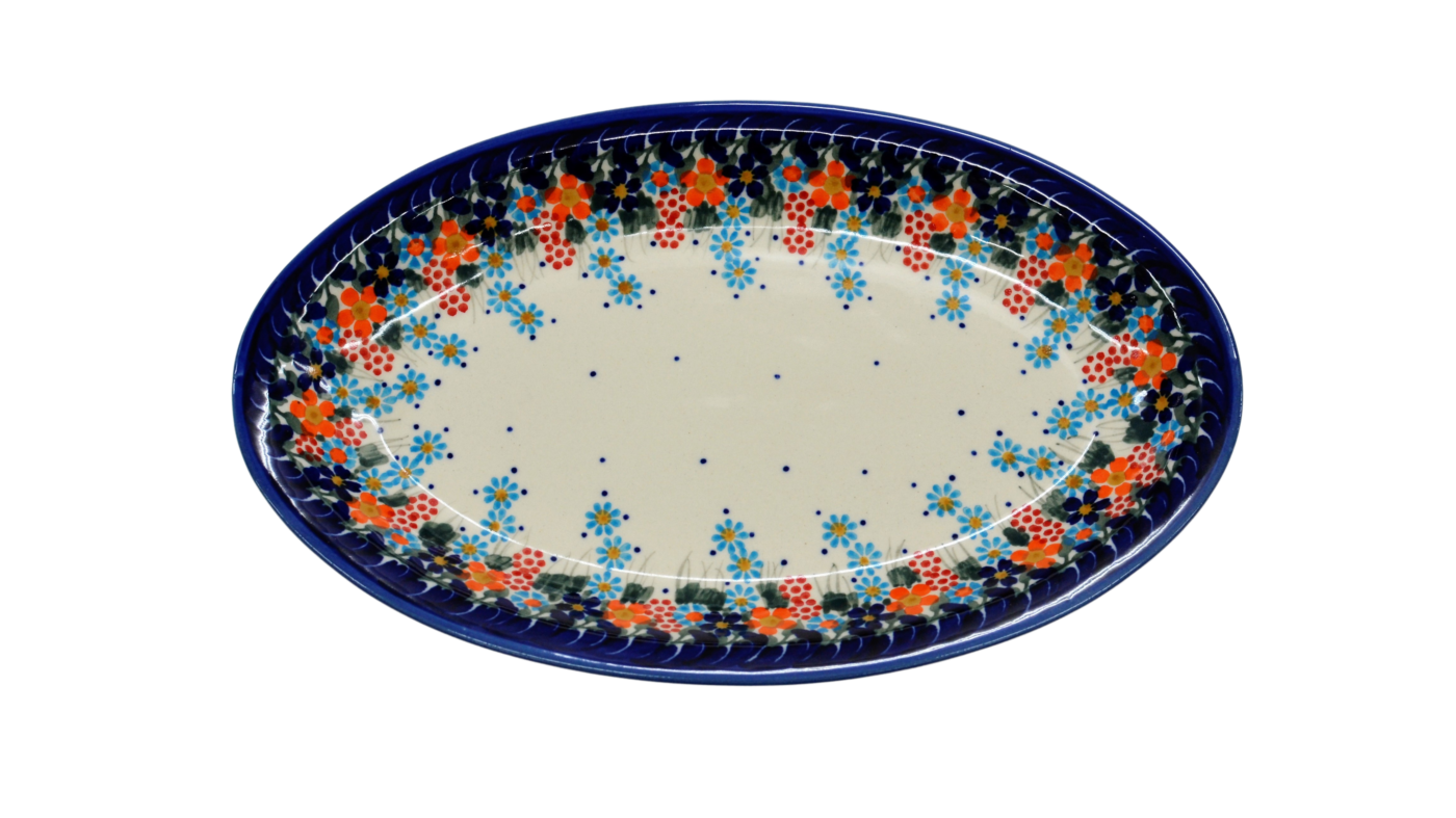 Duży, rozłożysty i przy tym elegancki półmisek ceramiczny w kształcie owalu, o szerokim zastosowaniu w kuchni, salonie czy podczas posiłków w jadalni. Jeszcze gorący i pachnący zapiekany kawał udźca owczego podany na tym naczyniu z pewnością ułatwi podanie posiłku. Nie zliczone są potrawy, które mogą zostać podane na naczyniach ceramiki bolesławieckiej. Pieczony indyk, rozpływająca się w ustach o chrupiącej skórce, zarumieniona kaczka z jabłkiem, pieczony karczek czy soczysty kawał dzika z przyprawami oraz wiele więcej potraw, które zdecydowanie z ogromną łatwością zostaną podane na stole podczas przyjęcia urodzinowego, imieninowego czy świąt.