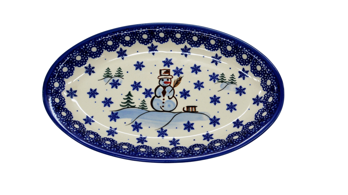 Półmisek salaterka na przystawki AMADEUS o 27 cm długości, ręcznie wykonany w bolesławieckiej manufakturze ceramiki artystycznej. Idealne naczynie ceramiczne do podawania potraw obiadowych, przystawek a nawet jako pojedyncze naczynie do podania obiadu (jako talerz).