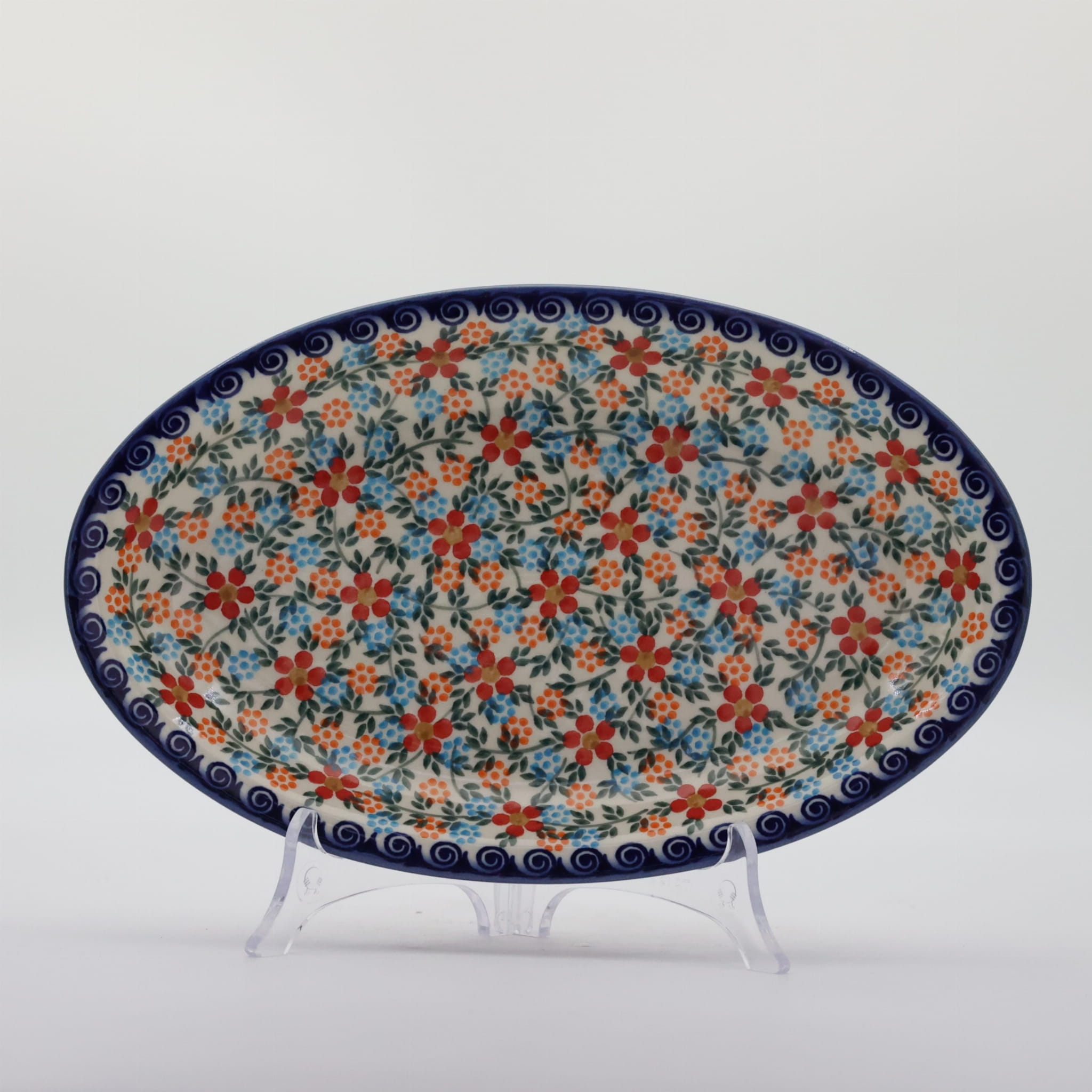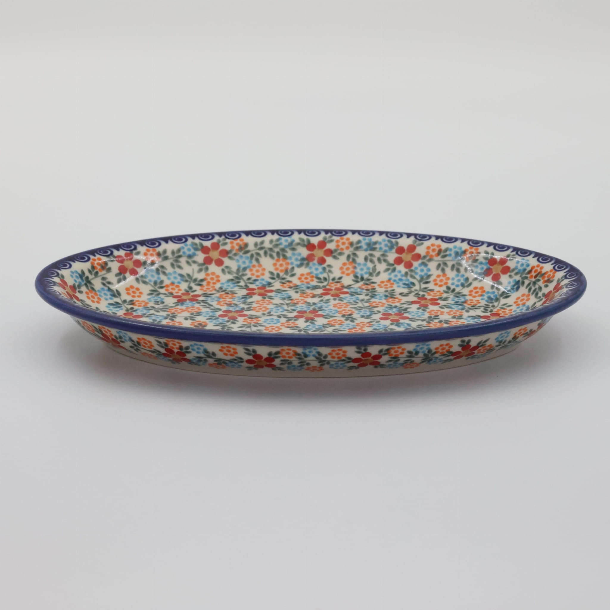 Duży, rozłożysty i przy tym elegancki półmisek ceramiczny w kształcie owalu, o szerokim zastosowaniu w kuchni, salonie czy podczas posiłków w jadalni. Jeszcze gorący i pachnący zapiekany kawał udźca owczego podany na tym naczyniu z pewnością ułatwi podanie posiłku. Nie zliczone są potrawy, które mogą zostać podane na naczyniach ceramiki bolesławieckiej. Pieczony indyk, rozpływająca się w ustach o chrupiącej skórce, zarumieniona kaczka z jabłkiem, pieczony karczek czy soczysty kawał dzika z przyprawami oraz wiele więcej potraw, które zdecydowanie z ogromną łatwością zostaną podane na stole podczas przyjęcia urodzinowego, imieninowego czy świąt.