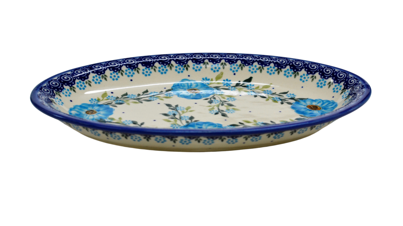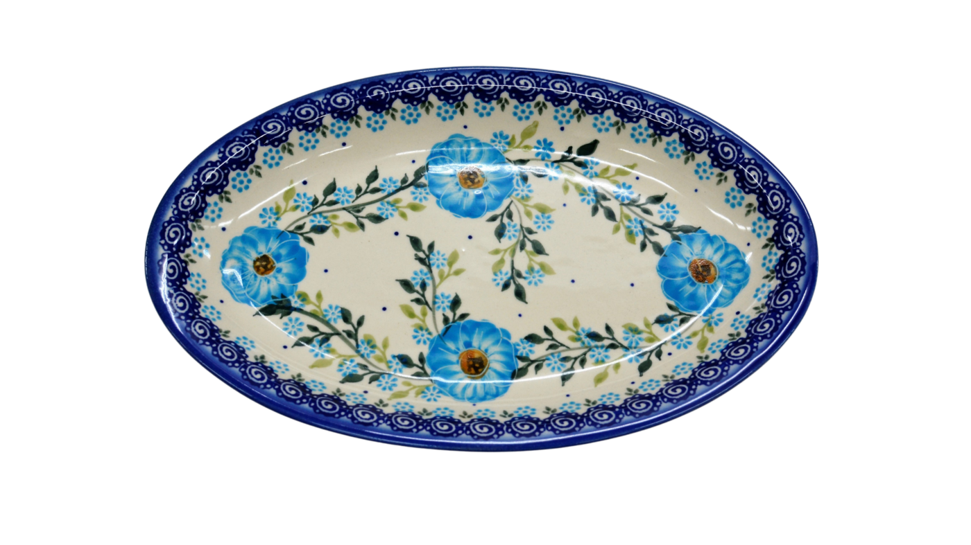 Duży, rozłożysty i przy tym elegancki półmisek ceramiczny w kształcie owalu, o szerokim zastosowaniu w kuchni, salonie czy podczas posiłków w jadalni. Jeszcze gorący i pachnący zapiekany kawał udźca owczego podany na tym naczyniu z pewnością ułatwi podanie posiłku. Nie zliczone są potrawy, które mogą zostać podane na naczyniach ceramiki bolesławieckiej. Pieczony indyk, rozpływająca się w ustach o chrupiącej skórce, zarumieniona kaczka z jabłkiem, pieczony karczek czy soczysty kawał dzika z przyprawami oraz wiele więcej potraw, które zdecydowanie z ogromną łatwością zostaną podane na stole podczas przyjęcia urodzinowego, imieninowego czy świąt.