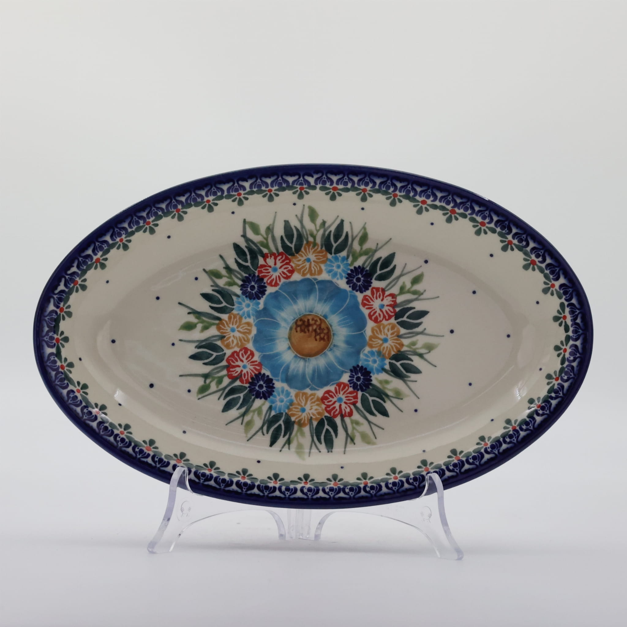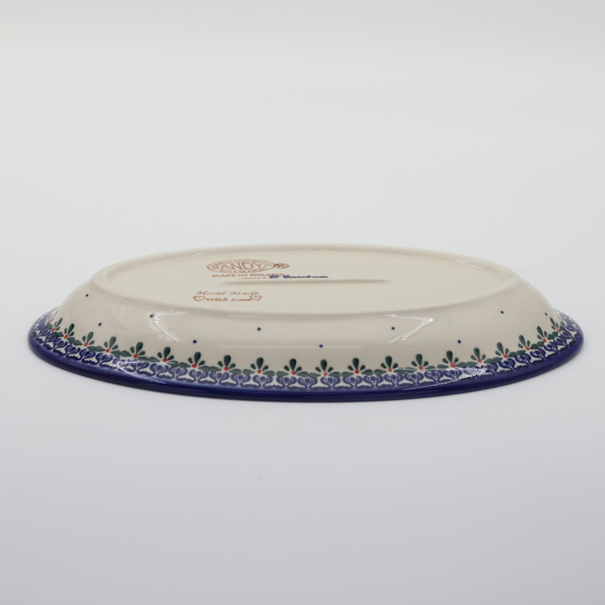 Półmisek salaterka na przystawki AMADEUS o 27 cm długości, ręcznie wykonany w bolesławieckiej manufakturze ceramiki artystycznej. Idealne naczynie ceramiczne do podawania potraw obiadowych, przystawek a nawet jako pojedyncze naczynie do podania obiadu (jako talerz).