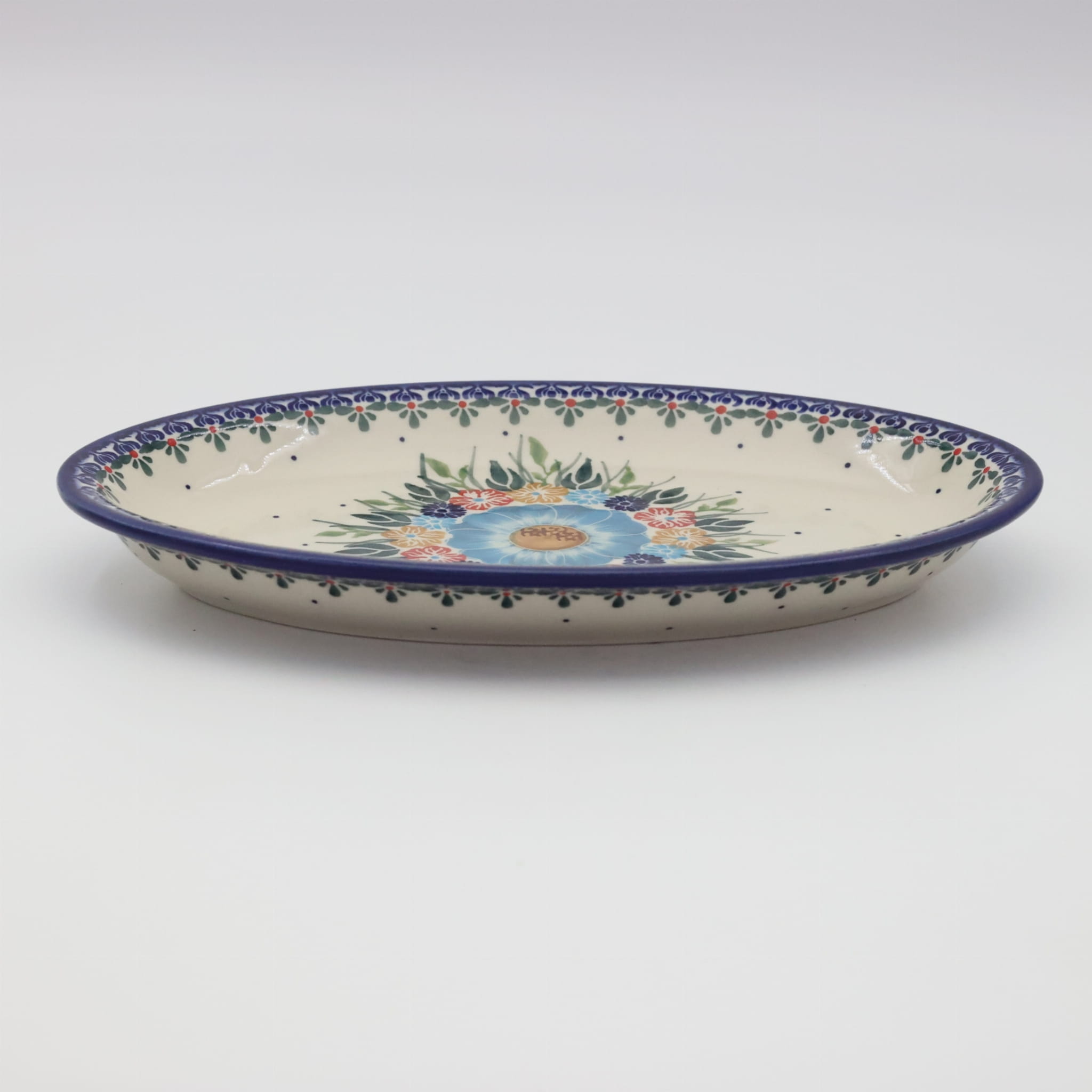 Duży, rozłożysty i przy tym elegancki półmisek ceramiczny w kształcie owalu, o szerokim zastosowaniu w kuchni, salonie czy podczas posiłków w jadalni. Jeszcze gorący i pachnący zapiekany kawał udźca owczego podany na tym naczyniu z pewnością ułatwi podanie posiłku. Nie zliczone są potrawy, które mogą zostać podane na naczyniach ceramiki bolesławieckiej. Pieczony indyk, rozpływająca się w ustach o chrupiącej skórce, zarumieniona kaczka z jabłkiem, pieczony karczek czy soczysty kawał dzika z przyprawami oraz wiele więcej potraw, które zdecydowanie z ogromną łatwością zostaną podane na stole podczas przyjęcia urodzinowego, imieninowego czy świąt.