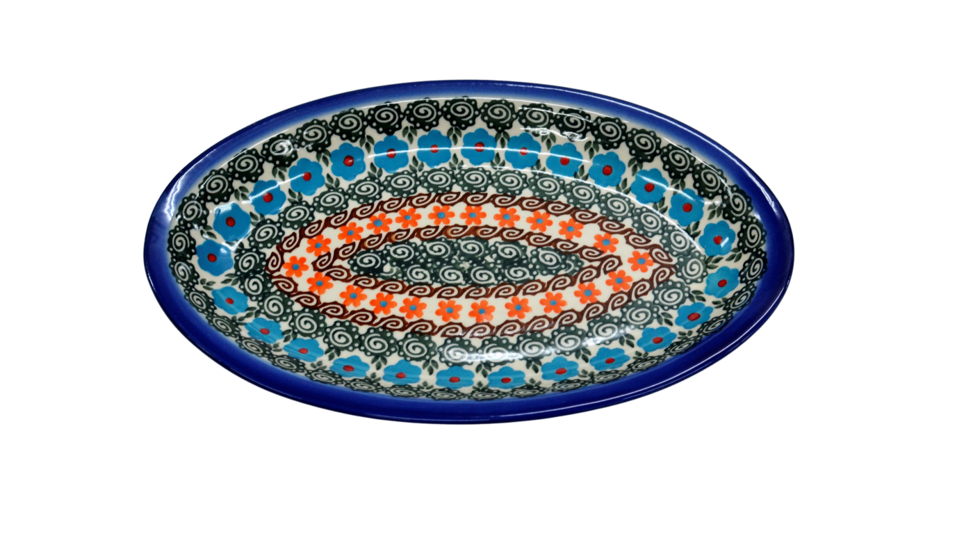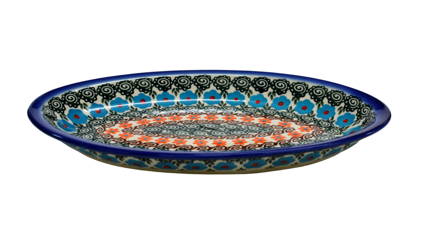 Duży, rozłożysty i przy tym elegancki półmisek ceramiczny w kształcie owalu, o szerokim zastosowaniu w kuchni, salonie czy podczas posiłków w jadalni. Jeszcze gorący i pachnący zapiekany kawał udźca owczego podany na tym naczyniu z pewnością ułatwi podanie posiłku. Nie zliczone są potrawy, które mogą zostać podane na naczyniach ceramiki bolesławieckiej. Pieczony indyk, rozpływająca się w ustach o chrupiącej skórce, zarumieniona kaczka z jabłkiem, pieczony karczek czy soczysty kawał dzika z przyprawami oraz wiele więcej potraw, które zdecydowanie z ogromną łatwością zostaną podane na stole podczas przyjęcia urodzinowego, imieninowego czy świąt.