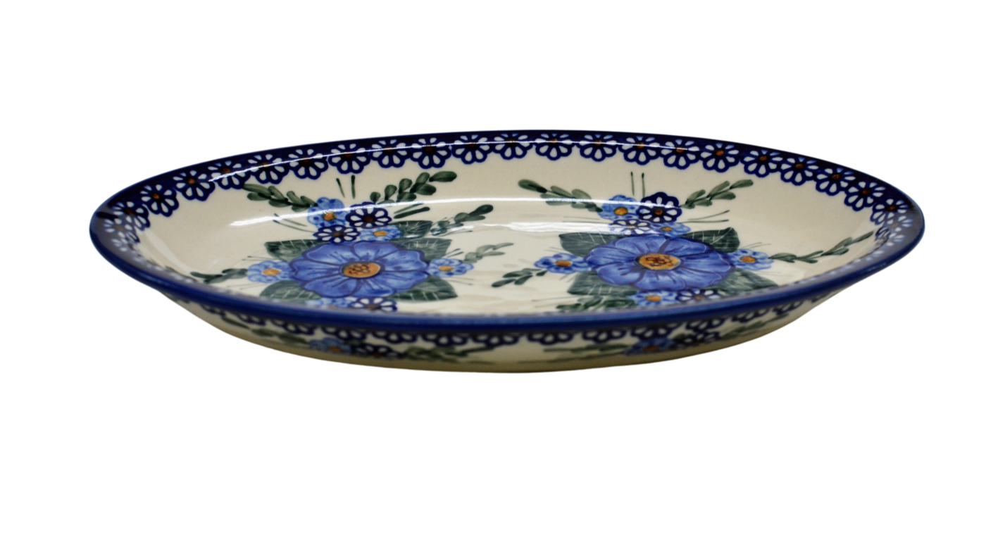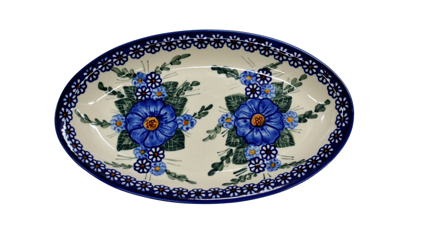 Duży, rozłożysty i przy tym elegancki półmisek ceramiczny w kształcie owalu, o szerokim zastosowaniu w kuchni, salonie czy podczas posiłków w jadalni. Jeszcze gorący i pachnący zapiekany kawał udźca owczego podany na tym naczyniu z pewnością ułatwi podanie posiłku. Nie zliczone są potrawy, które mogą zostać podane na naczyniach ceramiki bolesławieckiej. Pieczony indyk, rozpływająca się w ustach o chrupiącej skórce, zarumieniona kaczka z jabłkiem, pieczony karczek czy soczysty kawał dzika z przyprawami oraz wiele więcej potraw, które zdecydowanie z ogromną łatwością zostaną podane na stole podczas przyjęcia urodzinowego, imieninowego czy świąt.