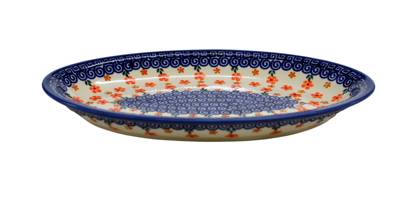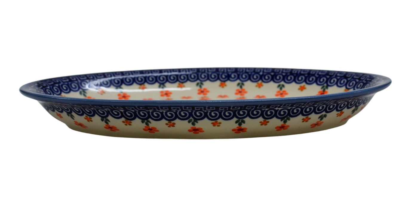 Duży, rozłożysty i przy tym elegancki półmisek ceramiczny w kształcie owalu, o szerokim zastosowaniu w kuchni, salonie czy podczas posiłków w jadalni. Jeszcze gorący i pachnący zapiekany kawał udźca owczego podany na tym naczyniu z pewnością ułatwi podanie posiłku. Nie zliczone są potrawy, które mogą zostać podane na naczyniach ceramiki bolesławieckiej. Pieczony indyk, rozpływająca się w ustach o chrupiącej skórce, zarumieniona kaczka z jabłkiem, pieczony karczek czy soczysty kawał dzika z przyprawami oraz wiele więcej potraw, które zdecydowanie z ogromną łatwością zostaną podane na stole podczas przyjęcia urodzinowego, imieninowego czy świąt.